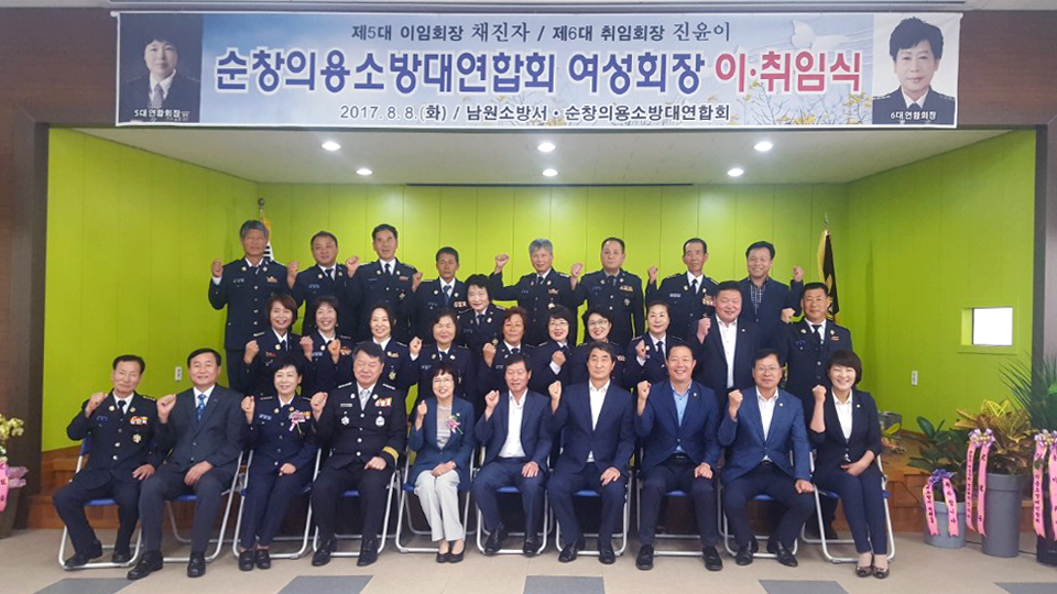 - 8일 순창 119안전센타 회의실에서 순창군 의용소방대연합회 채진자 여성대장 이임식과 신임 진윤이 여성대장 취임식이 열렸다.이날 장명균 부군수를 비롯해 김종섭 군의장, 도내 시군 의용소방연합회 회장단, 관내 읍면 의용소방대장 및 대원 등 70여명이 참석했다. -2017년 8월 8일-