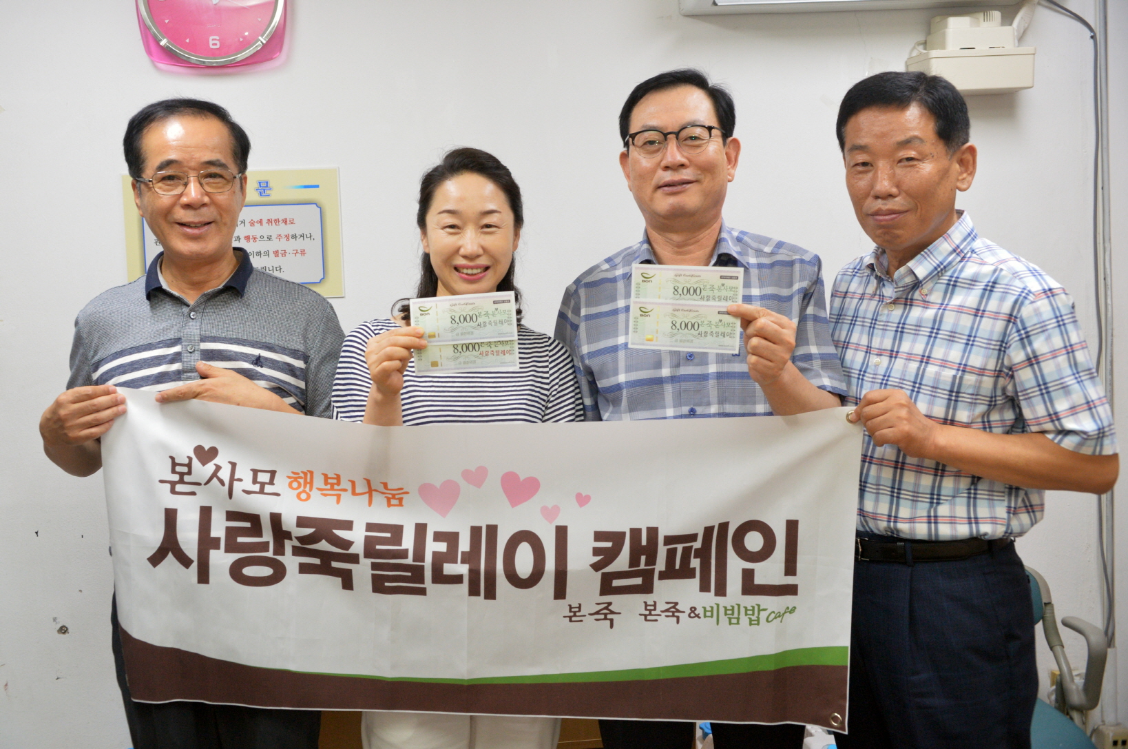 - 8일 전국 본죽 가맹점주 760명 회원들로 구성된 본사모(회장 박동운) 이갑순, 이선주 운영회원이 순창군청을 찾아 독거노인 및 어려운 이웃들에게 지원해 달라며 8,000원권 본죽 상품권 50매 40만원 상당을 전달했다. -2017년 8월 8일-
