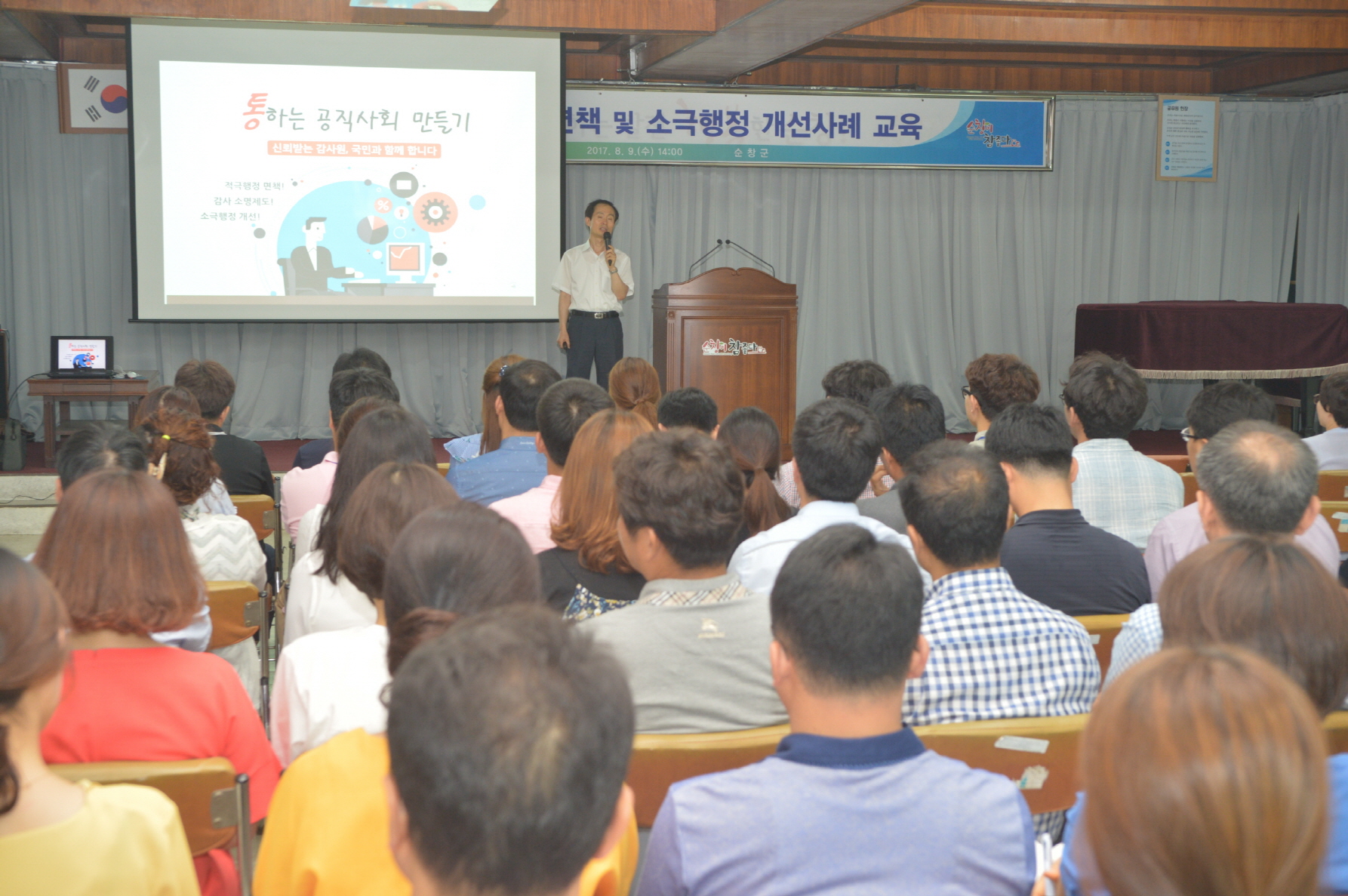 - 9일 3층 회의실에서 직원 150여명이 참석한 가운데 군민을 위해 적극적으로 일하는 분위기 만들기위해 적극행정 면책제도 및 소극행정 개선 사례 교육을 실시했다. 이번 교육은 감사원 김건수 감사연구원의 강의로 공직자들이 주민들을 이익을 위해 적극적으로 일하는 과정에서 실수로 발생하는 일들에 대해 감사원법에 따른 불이익한 처분 요구를 면제 또는 감경하는 ‘적극행정 면책제도’를 바로 알리기 위해 마련된 교육이다. -2017년 8월 9일-