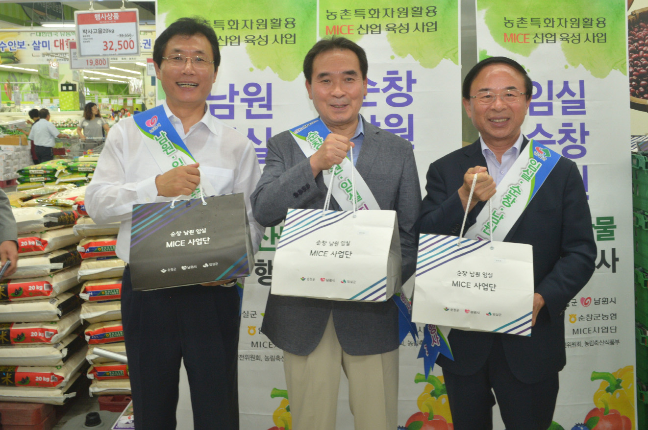 - 14일 서울 창동 하나로유통센터에서 순창, 남원, 임실 동남부 생활권 지역 대표 농산물 판촉행사를 진행했다. 이번 행사는 농촌특화자원활용 MICE산업 육성사업 일환으로 진행됐으며 세 지역 대표 농산물에 대해 무료시식 및 판촉행사를 진행해 소비자들에게 큰 호응을 얻었다. (재)순창건강장수연구소 MICE사업단이 주최했으며 순창, 남원, 임실군 조합공동사업법인이 주관했다. 황숙주 군수, 이환주 남원시장, 심민 임실군수를 비롯해 세지역 조합공동사업법인 대표 농협조합장등 50여명이 대거 참여해 지역 농산물 홍보에 구슬땀을 흘렸다. -2017년 7월 14일-