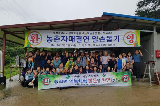 - 부산시 사상구 학장동 주민자치위원회(회장 강호경) 40여명이 15일 풍산면 우곡리 김문숙씨 블루베리 농장 체험에 나섰다.이날 학장동 주민자치위원회는 평소 도시에서는 볼 수 없는 초록물결 속에서 블루베리 수확을 체험하면서 순창의 아름다운 환경과 청정농산물을 경험하고 배웠다. -2017년 7월 17일-