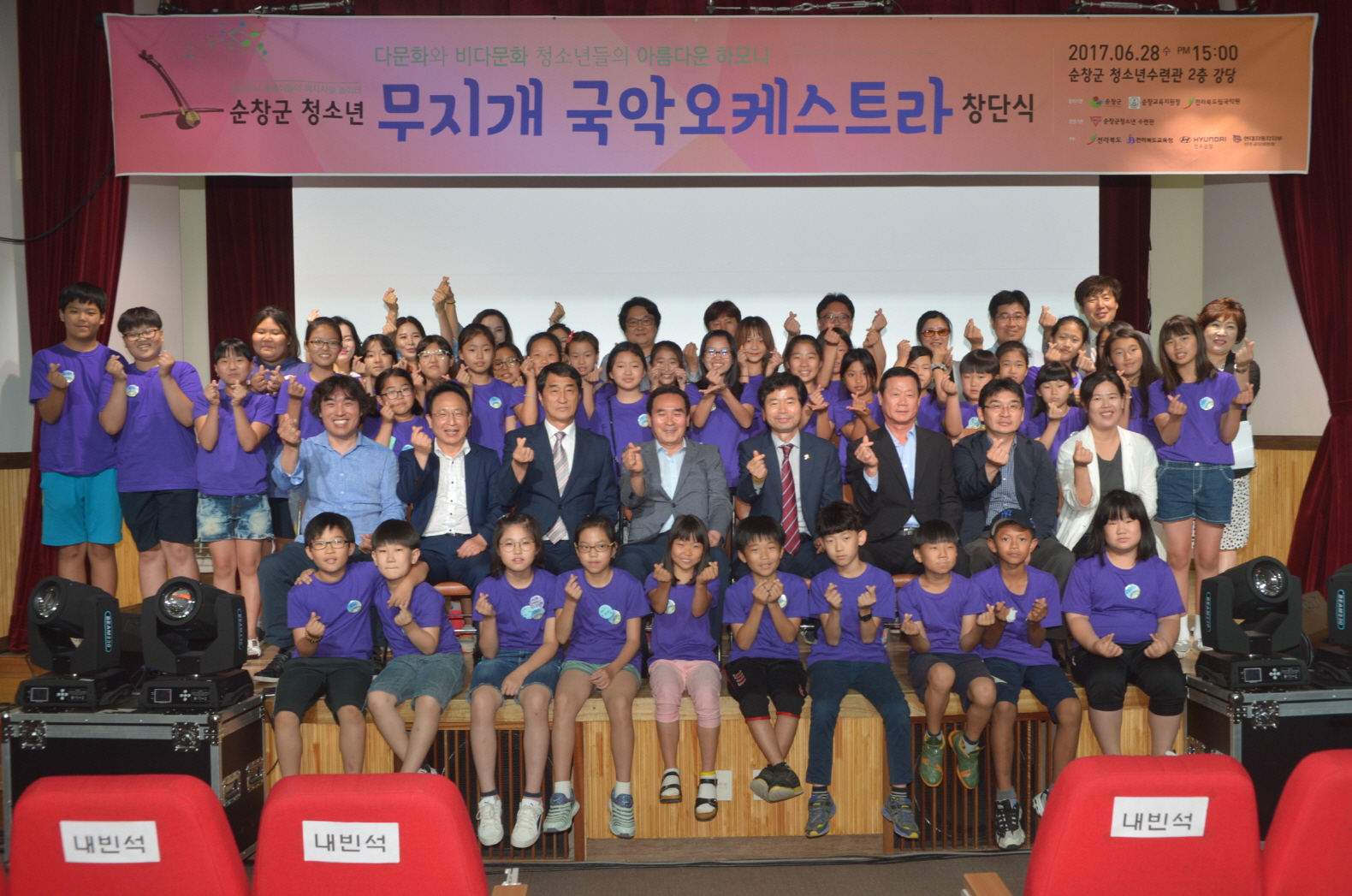 - 28일 순창 청소년수련관 에서 다문화와 비다문화 청소년들이 함께 만드는 아름다운 국악 오케스트라인 순창 무지개 국악오케스트라가 창단했다.순창군과 전라북도도립국악원, 순창교육지원청, 현대자동차 전주공장이 손을 맞잡은 이날 창단식에 김승환 전라북도 교육감, 황숙주 군수, 김종섭 군의회 의장, 김용군 순창교육지원청장, 최영일 도의원, 신동원 도립국악원장 등 내빈과 청소년 무지개 국악오케스트라 단원 등 관계자 200여명이 참석해 창단을 축하했다. -2017년 6월 28일-
