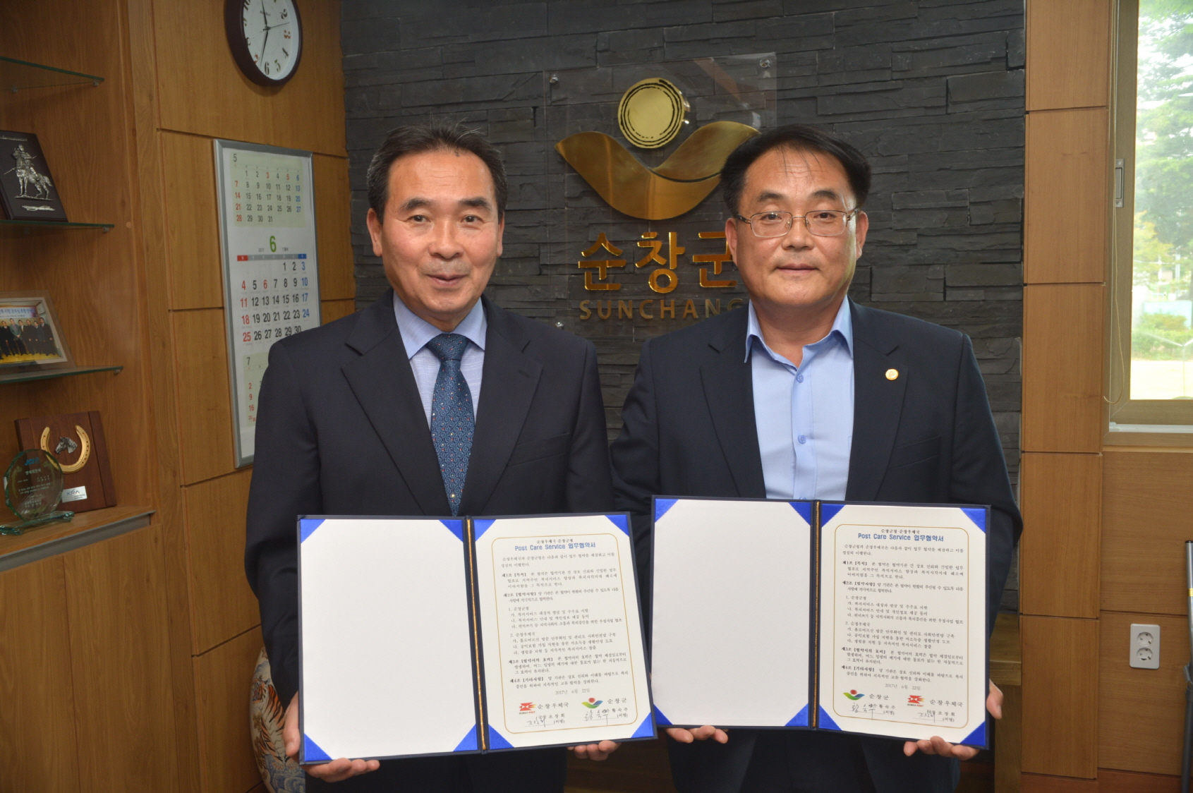 - 순창군과 순창우체국이 우체국돌보미서비스(Post Care Servic)의 원활한 추진을 위해 22일 순창군청 군수실에서 업무협약을 체결했다. 우체국돌보미서비스(Post Care Servic)는 집배원 등 우체국 직원이 주1회 이상 농어촌 지역의 홀로 어르신을 정기적으로 방문해 어르신들의 거동상태, 안부확인, 말벗되기, 애로사항 등을 확인하고 그 결과를 자녀에게 알려주는 서비스다.이날 업무협약식에는 황숙주군수, 김병수 전북지방우정청장, 조장회순창우체국장 등 관계자 20여명이 참석했다. -2017년 6월 22일-