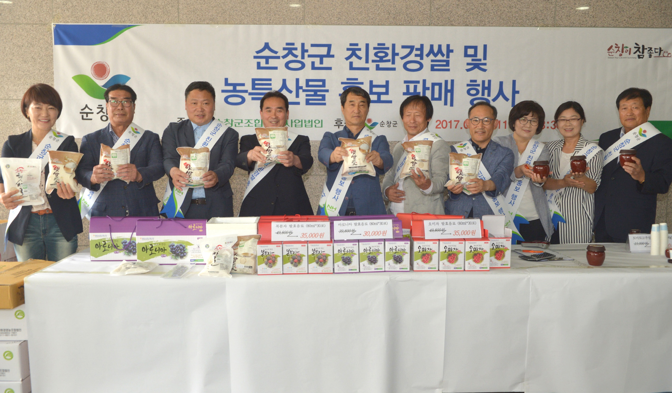 - 31일 제주도청에서 제주도 학교급식으로 올해 순창친환경 쌀 400여톤 공급을 확정 지은데 이어 토마토고추장 등 순창의 대표 농·특산물 홍보 및 판매 행사를 가졌다.이날 황숙주 군수를 비롯해 김종섭 군의회 의장 및 군의원, 한재현 NH농협 순창군지부장, 이대식 순창농협장, 이두용 구림농협장, 설득환 서순창 농협장, 유광희 조공법인대표 등 농업관계자 20여명이 대거 참석해 순창농산물을 홍보하고 제주도 김방훈 정무부지사를 만나 앞으로 순창 농산물을 지속적으로 납품할 수 있도록 당부했다. -2017년 5월 31일-