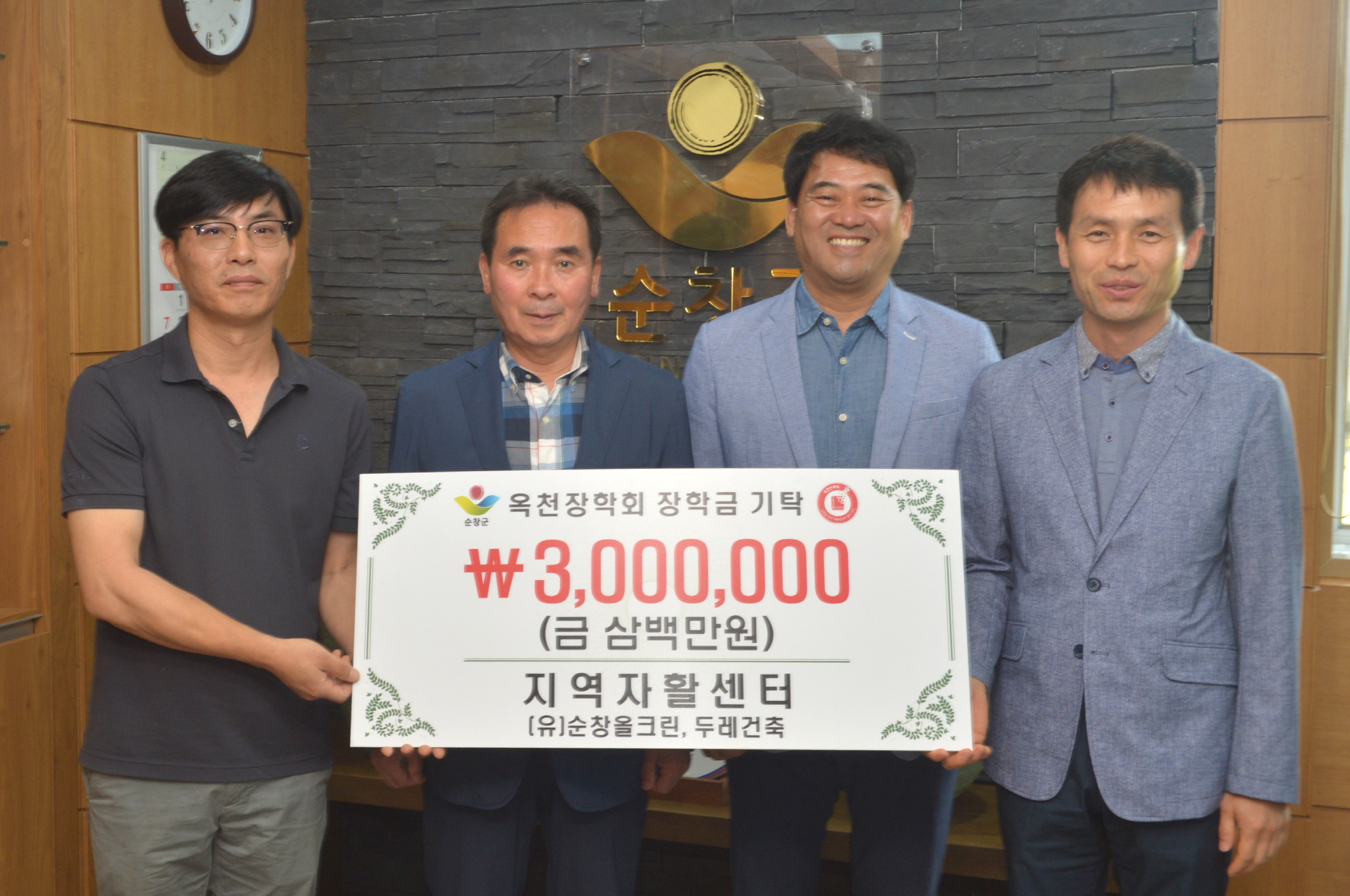 - 30일 순창지역자활센터(센터장 한승연)에서는 센터 소속 자활기업인 (유)두레건축(대표 곽병현, 육근용) 및 (유)순창올크린(대표 강남훈, 안준표)과 함께 순창군청을 방문해 옥천인재숙 학생들을 위해 써달라며 장학금 300만원을 기탁했다. -2017년 5월 30일-