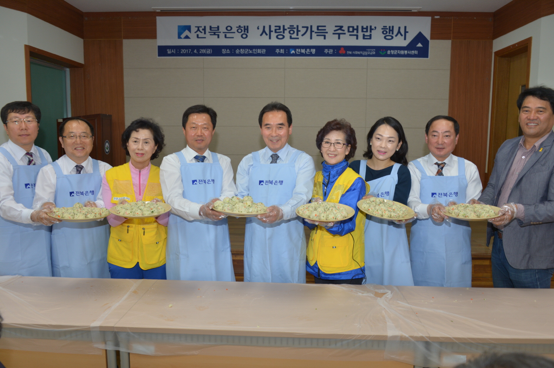- 28일 순창군 노인장애인복지회관에서 전북은행의 사랑한가득 주먹밥 행사가 열렸다. 이날 순창군 장애우와 어르신 200여명을 초청해 황숙주 군수, 전북은행 이정영부행장, 순창군여성자원봉사센터 자원봉사자들이 주먹밥과 국수를 만들어 대접하였다. -2017년 4월 28일-