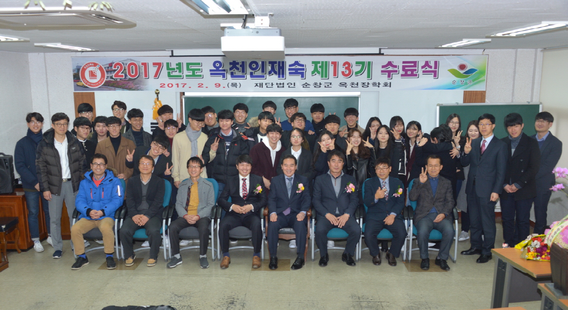 - 2017년도 옥천인제숙 제13기 수료식이 수료생 43명과 학부모, 재학생 등 150여명이 참석한 가운데 인재숙 회의실에서 열렸다. 이날 수료증과 사진첩을 수여하고 이사장 인사, 재학생 송사, 수료생 답사에 이어 꽃다발 증정과 기념촬영 순으로 진행됐다. -2017년 2월 9일-