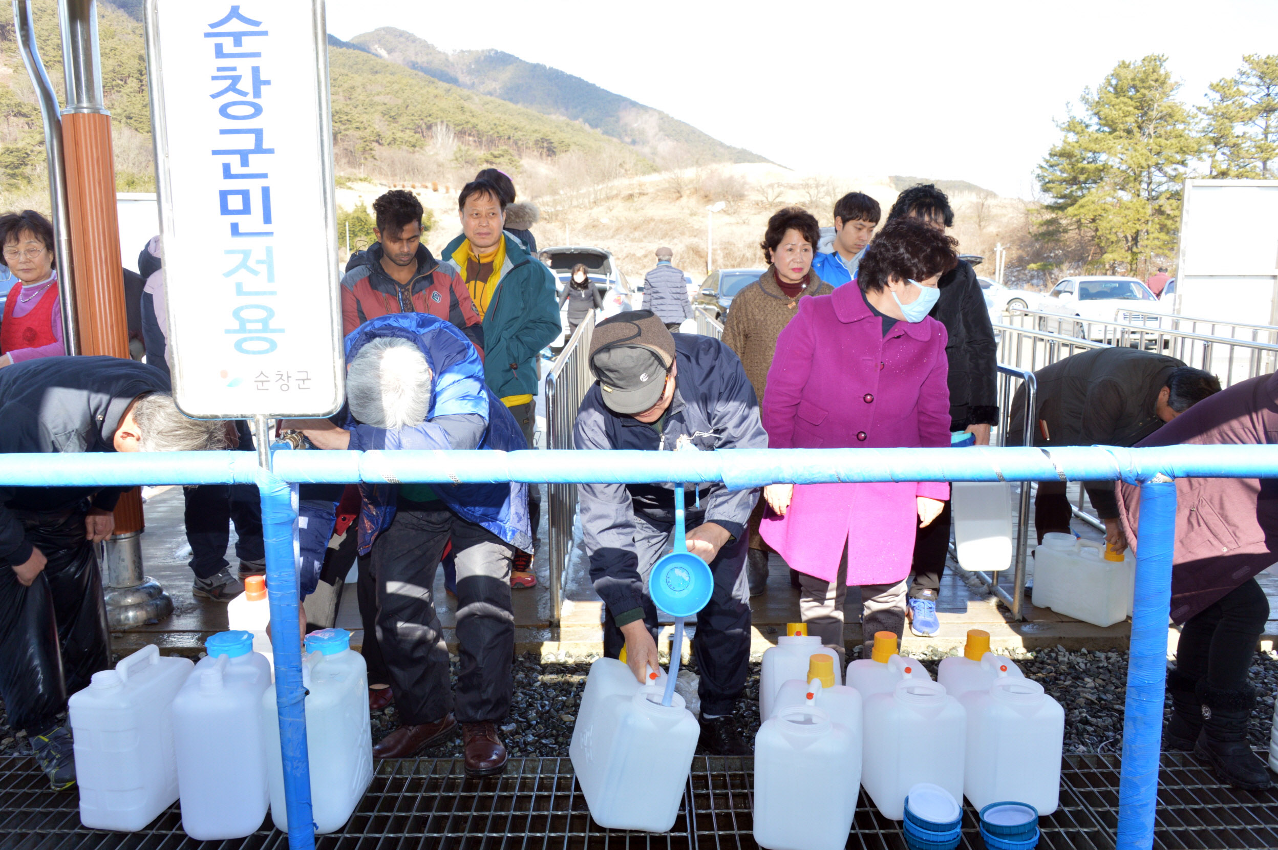 - 매일 아침 6시부터 저녁 8시까지 무료로 운영하고 있는 강천산음용온천수에 찾아오는 인파로 북적이고 있다. -2017년 2월 12일-