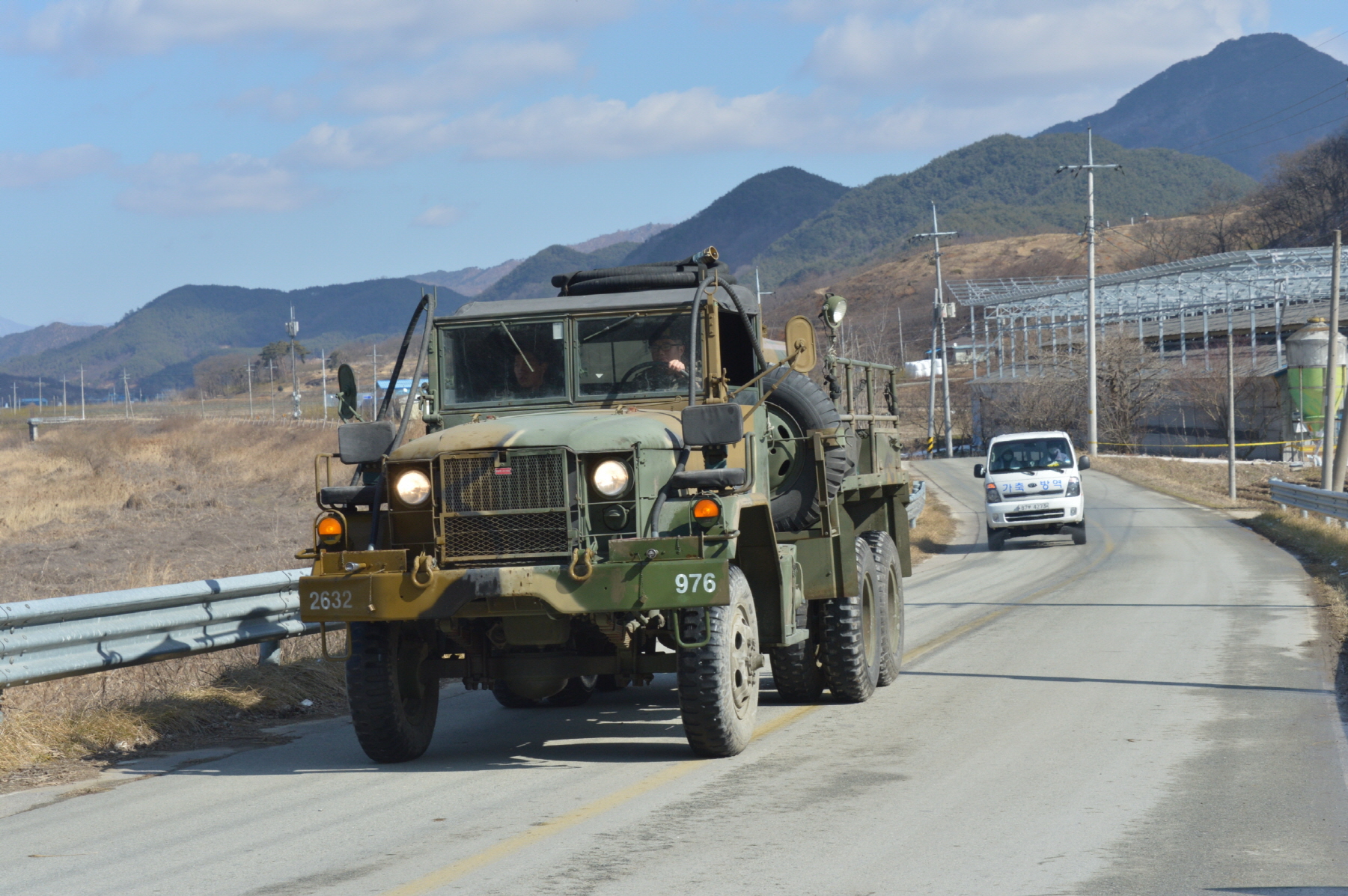 - 12일 구제역과 AI확산방지를 위해 동계면 일대 축사 주요도로변에 35사단 제독차량이 순정축협과 순창군청 방역차량과 함께 일제소독을 하고 있다. -2017년 2월 12일-