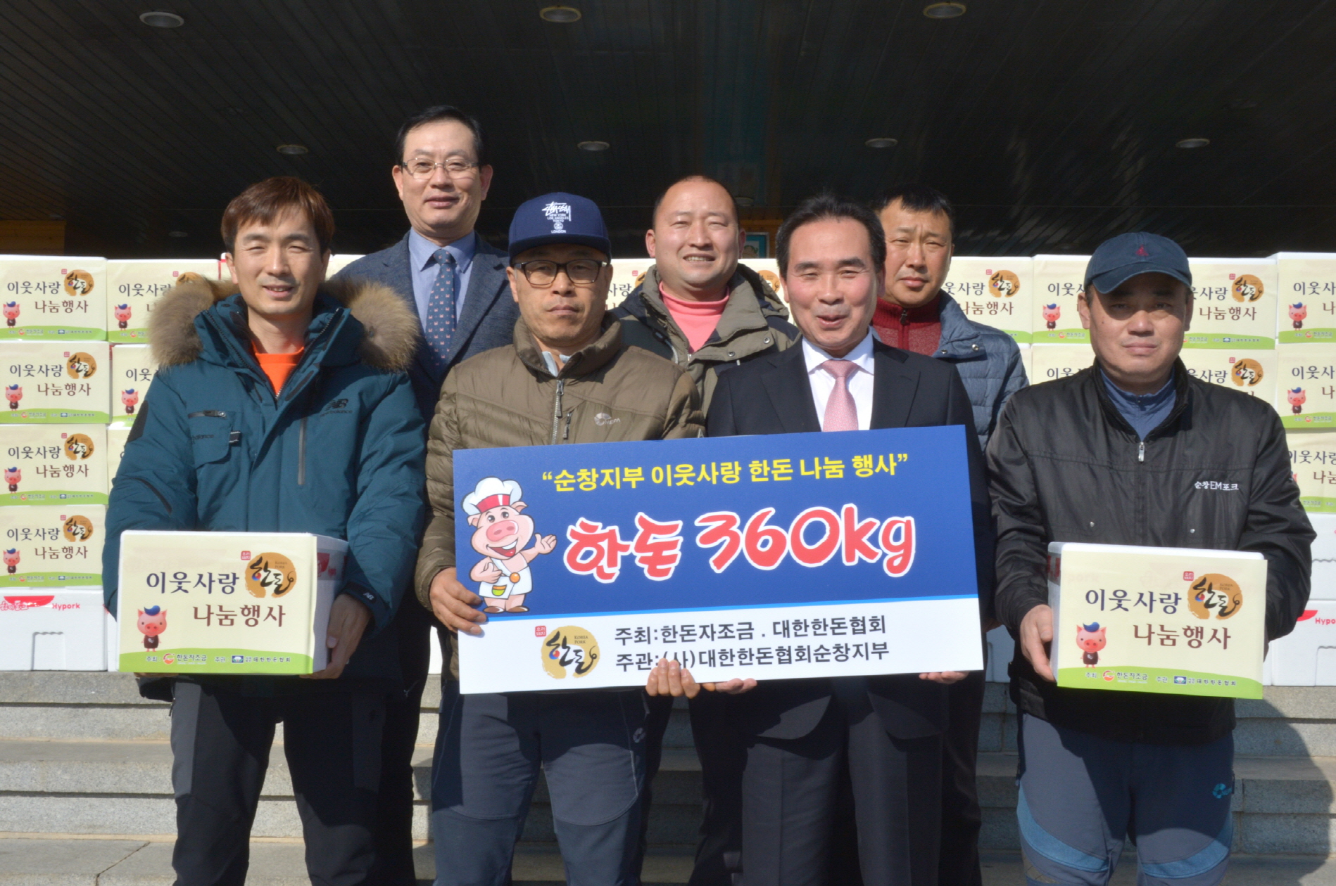 - 순창 한돈협회(회장 정운호)는 25일 관내 사회복지시설 등 어려운 이웃들에게 전달해 달라며 2kg 돼지고기 180상자380만원 상당을 사회복지공동모금회를 통해 황숙주 순창군수에게 지정 기탁했다. -2017년 1월 25일-