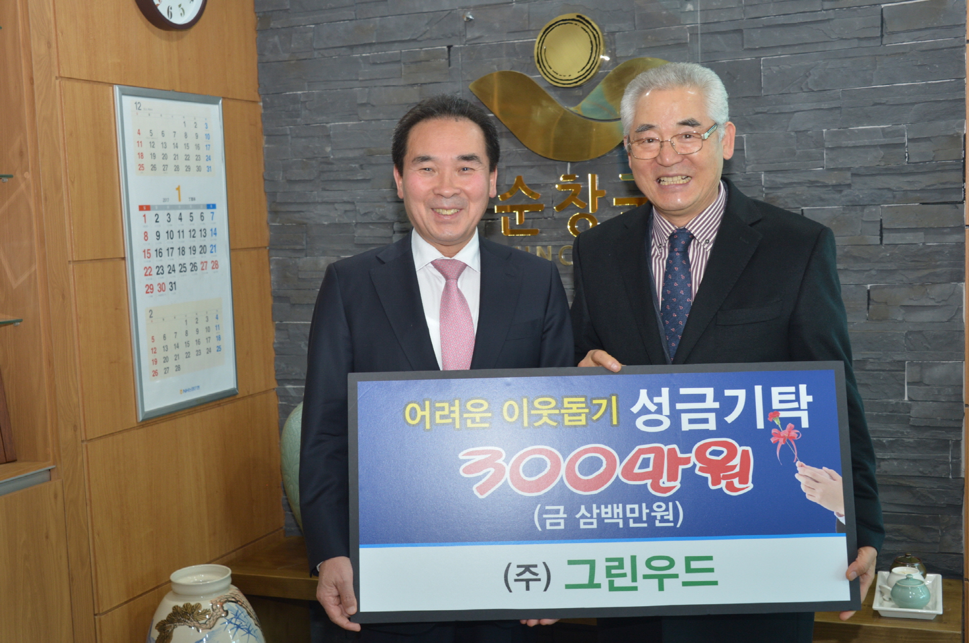 - (주)그린우드 김태환 대표는 설명절을 앞둔 25일 어려운 이웃들에게 써달라며 순창군청을 찾아 성금 300만원을 기탁했다. -2017년 1월 25일-