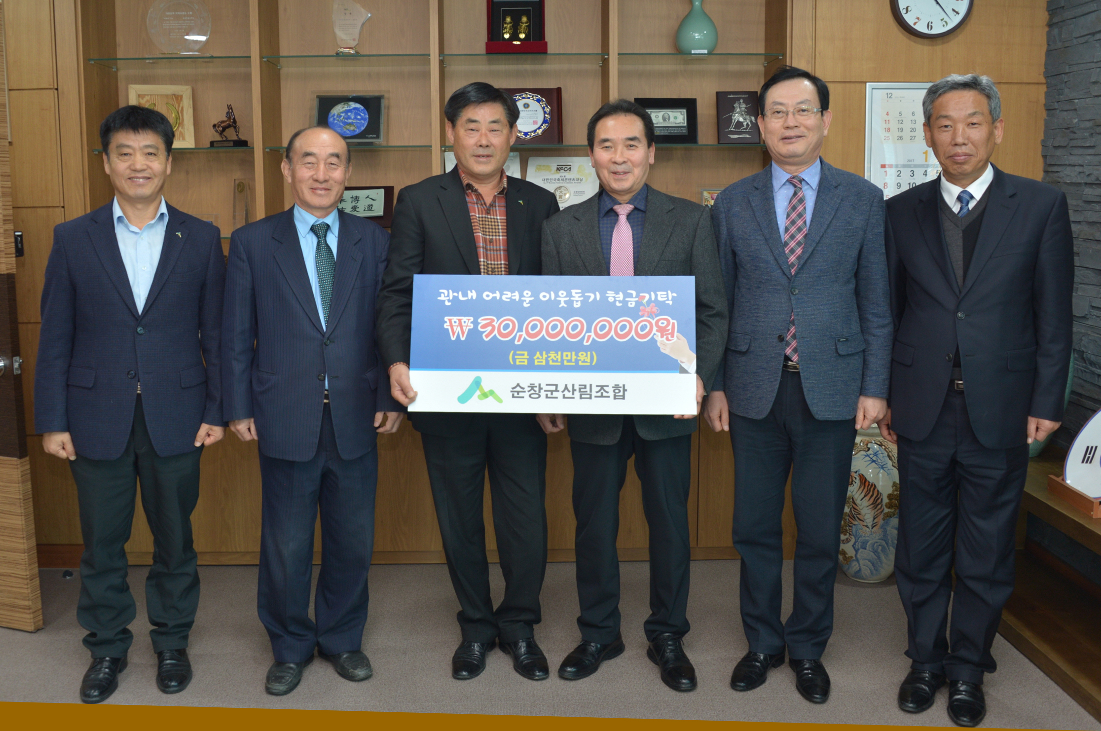 - 순창군 산림조합(조합장 김규철)은 26일 순창군청을 찾아 소외되고 경제적인 도움이 필요한 장애인들의 무료급식에 써달라며 3,000만원의 성금을 기탁했다. -2017년 1월 25일-