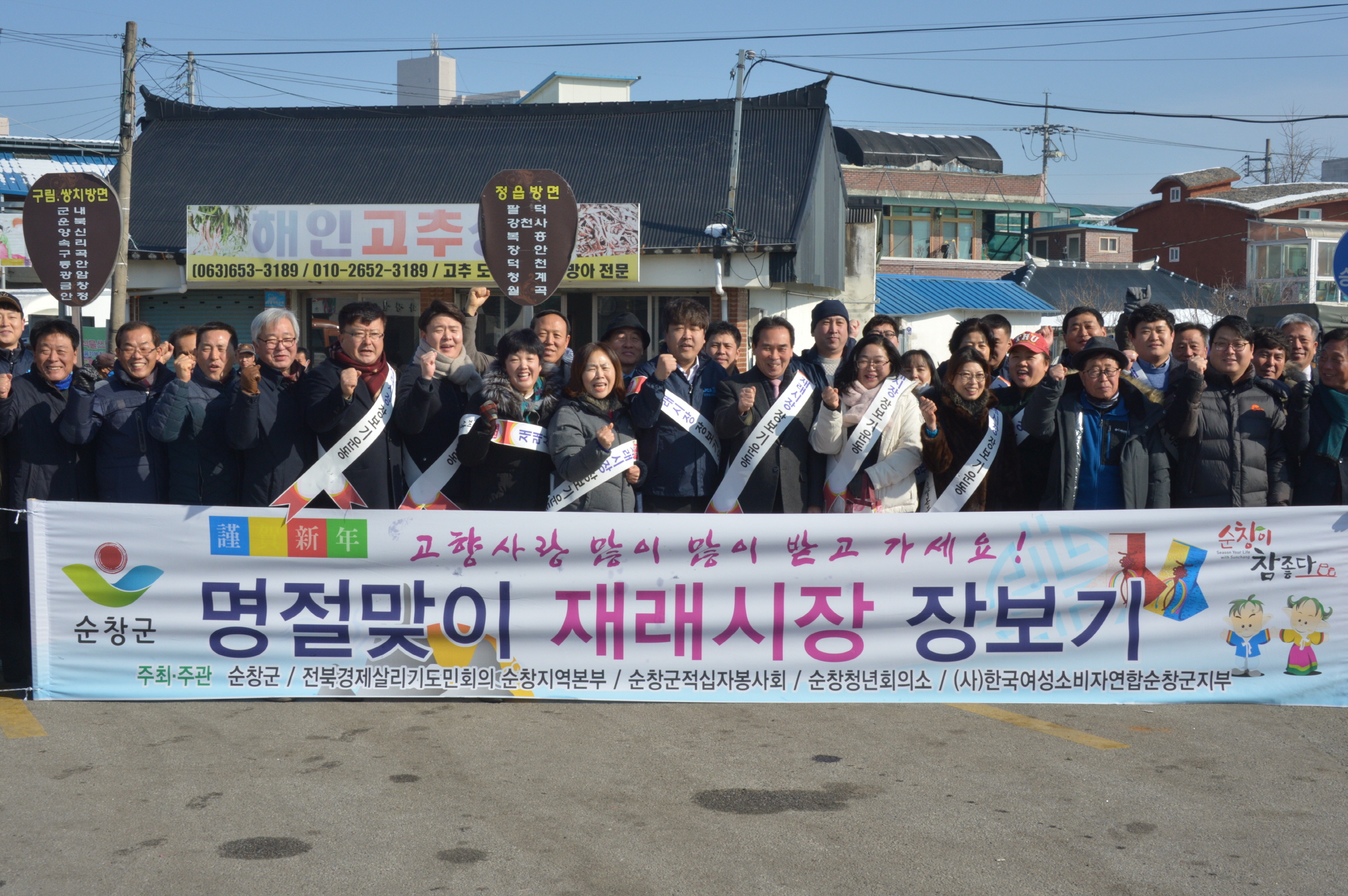 - 26일 전북경제살리기도민회의 순창지역본부(본부장 정광필)은 설명절을 맞아 순창청년회의소, 순창군적십자봉사회, 한국여성소비자연합 순창군지부 회원들과 함께 명절맞이 재래시장 장보기 캠페인을 펼쳤다. -2017년 1월 26일-