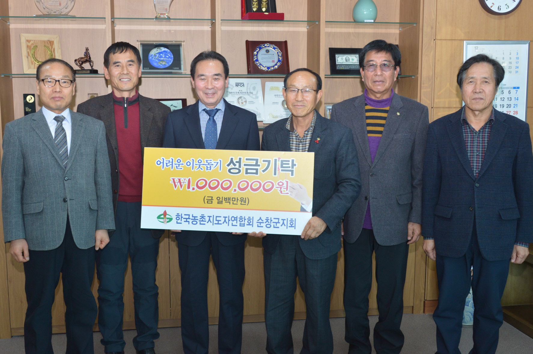 - 6일 한국농촌지도자회 순창군지회(회장 김형준)는 6일 회원들이 매달 1만원씩 모은 회비를 아껴 모은 100만원을 어려운 이웃들에게 전달해 달라며 황숙주 순창군수에게 기탁했다. -2017년 1월 6일-