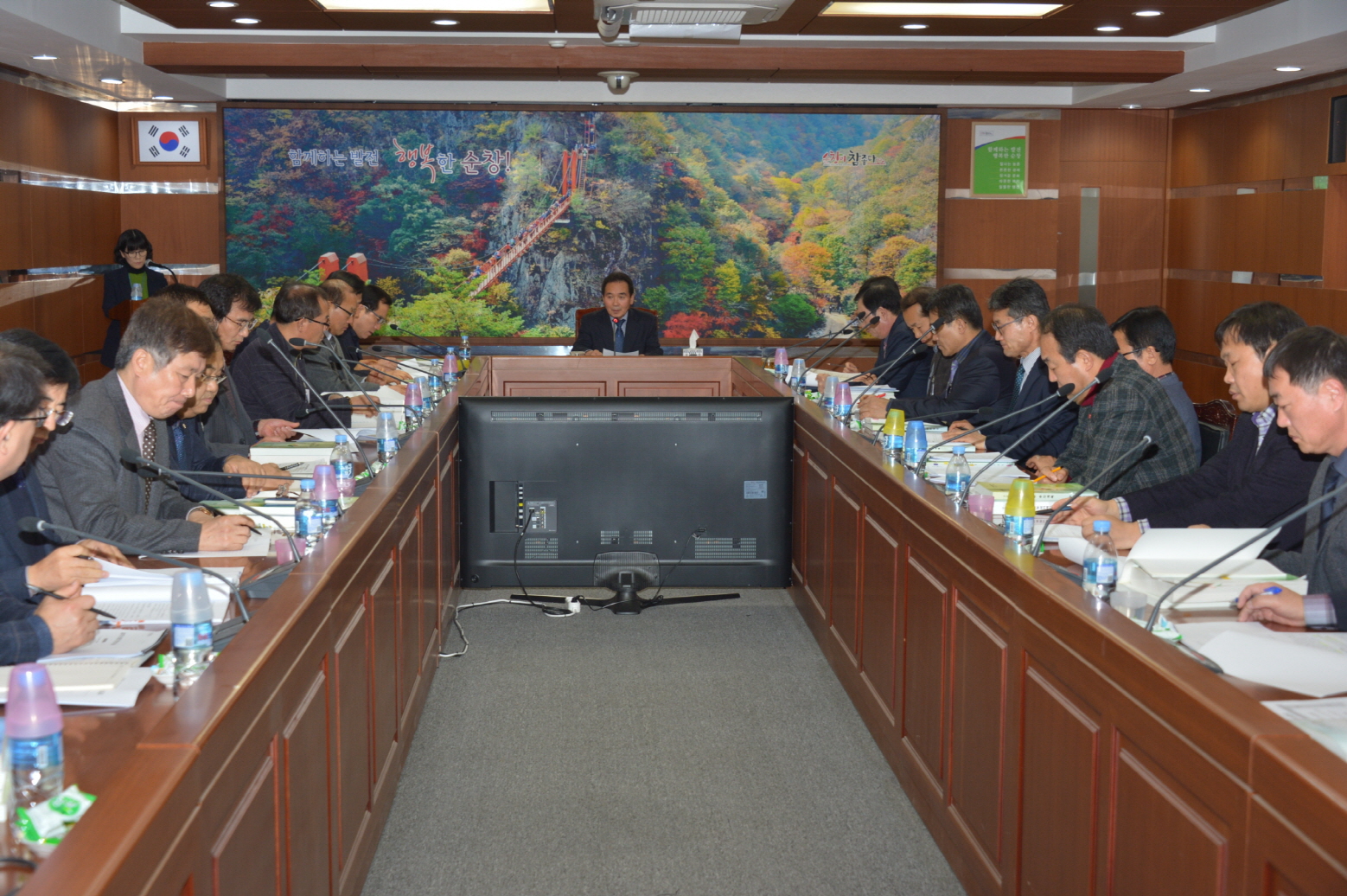 - 6일 영상회의실에서 전 실 과장들이 참석한 가운데 2017년 새해 업무보고를 가졌다. 이날 보고회는 황숙주 군수가 주재한 가운데 올해 진행되는 75개 현안사업에 대해 보고하고 부서별 주요업무와 국가예산확보 방안 등 효율적인 업무 추진을 위해 전방위적으로 논의하는 방식으로 진행됐다. -2017년 1월 6일-
