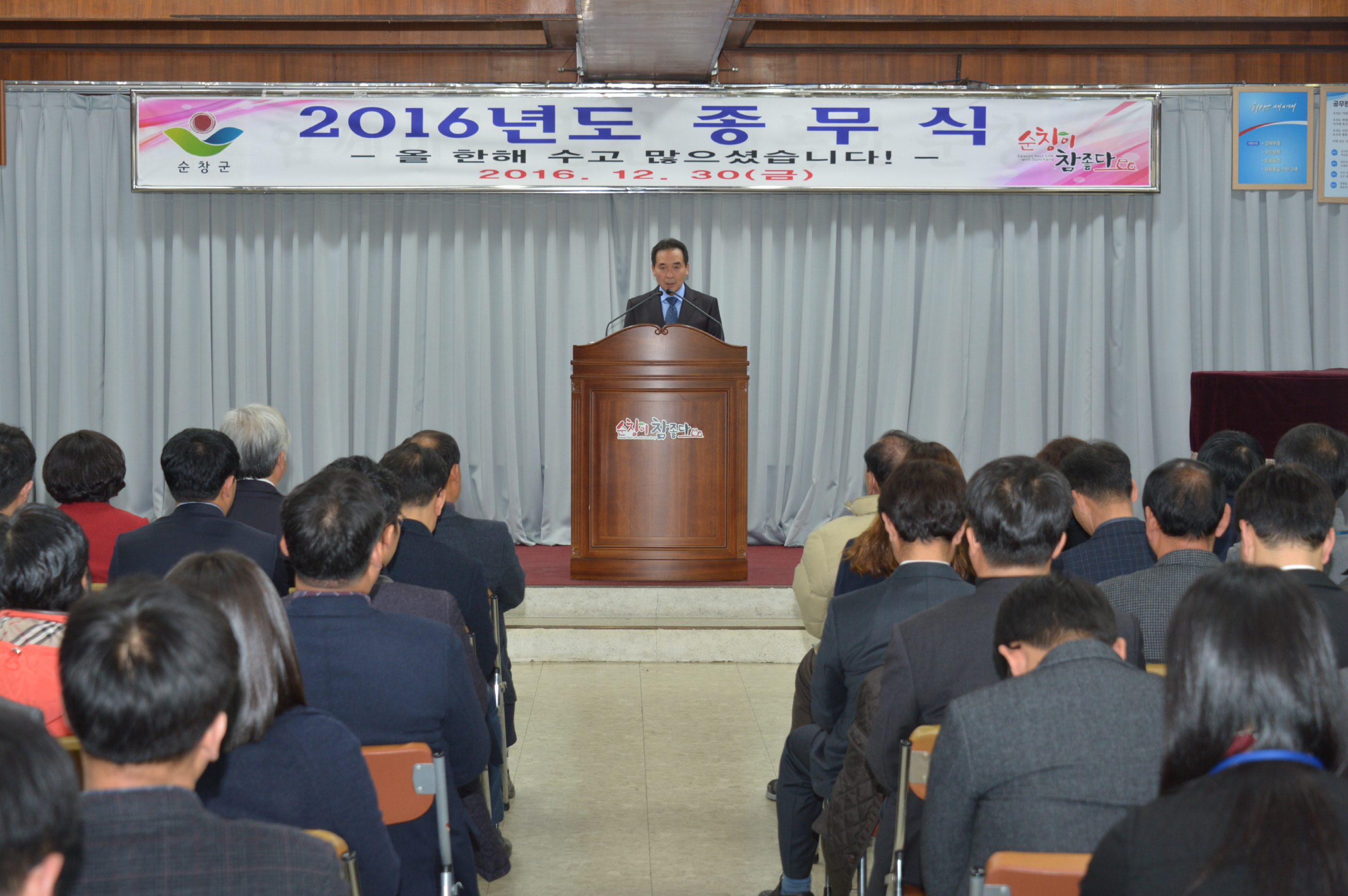- “2016년은 국가적 위기 속에서도 우리군은 군민들과 함께 1,193억원의 국가예산을 확보하고 장류혁신기반 등 다양한 분야에서 성과를 거둔 한해였습니다." 황숙주 군수는 30일 군청 대회의실에서 종무식을 열고 한해동안 성원해준 군민들에게 감사의 말을 전하고 직원들의 노고를 격려했다. -2016.12.30-