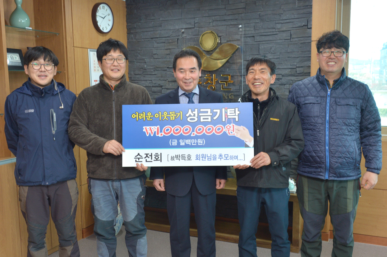 - 순창에서 전기관련 일을 하고 있는 사람들의 모임인 순건회(회장 정영복)에서 6일 순창군청을 찾아 황숙주 군수에게 어려운 이웃들에게 써달라며 100만원의 성금을 기탁했다. -2017년 1월 6일-