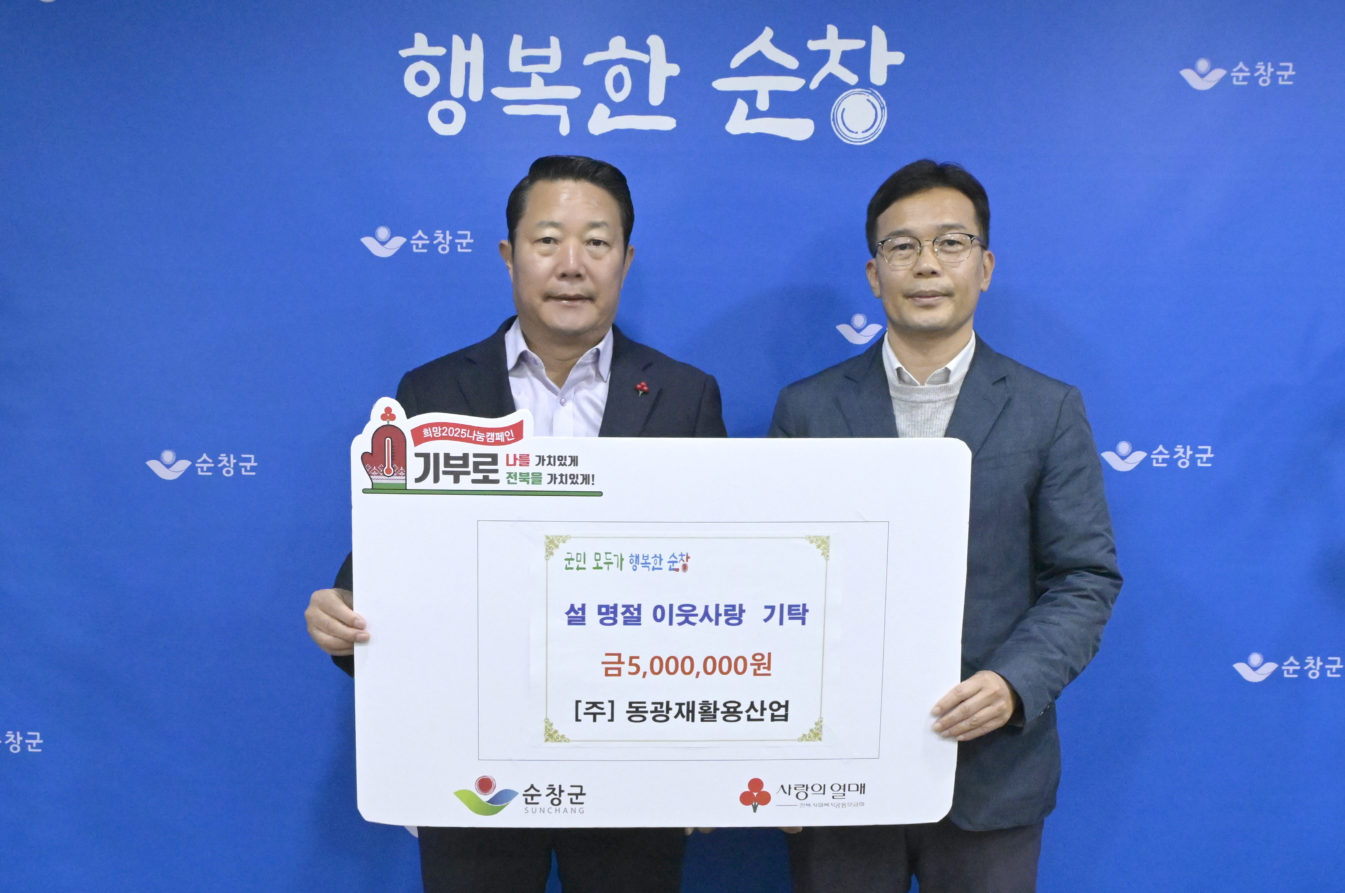 - ㈜동광재활용산(대표 김양술)이 22일 순창군청을 방문해 설 명절을 맞아 관내 어려운 이웃을 위한 성금 500만원을 기탁했다. ㈜동광재활용산업은 금과면 대각길에 위치한 건축자재 제조업체로, 콘크리트 타일과 기와, 벽돌 등을 생산하며 지역 경제 발전에 기여하고 있다. -2025년 1월 22일-