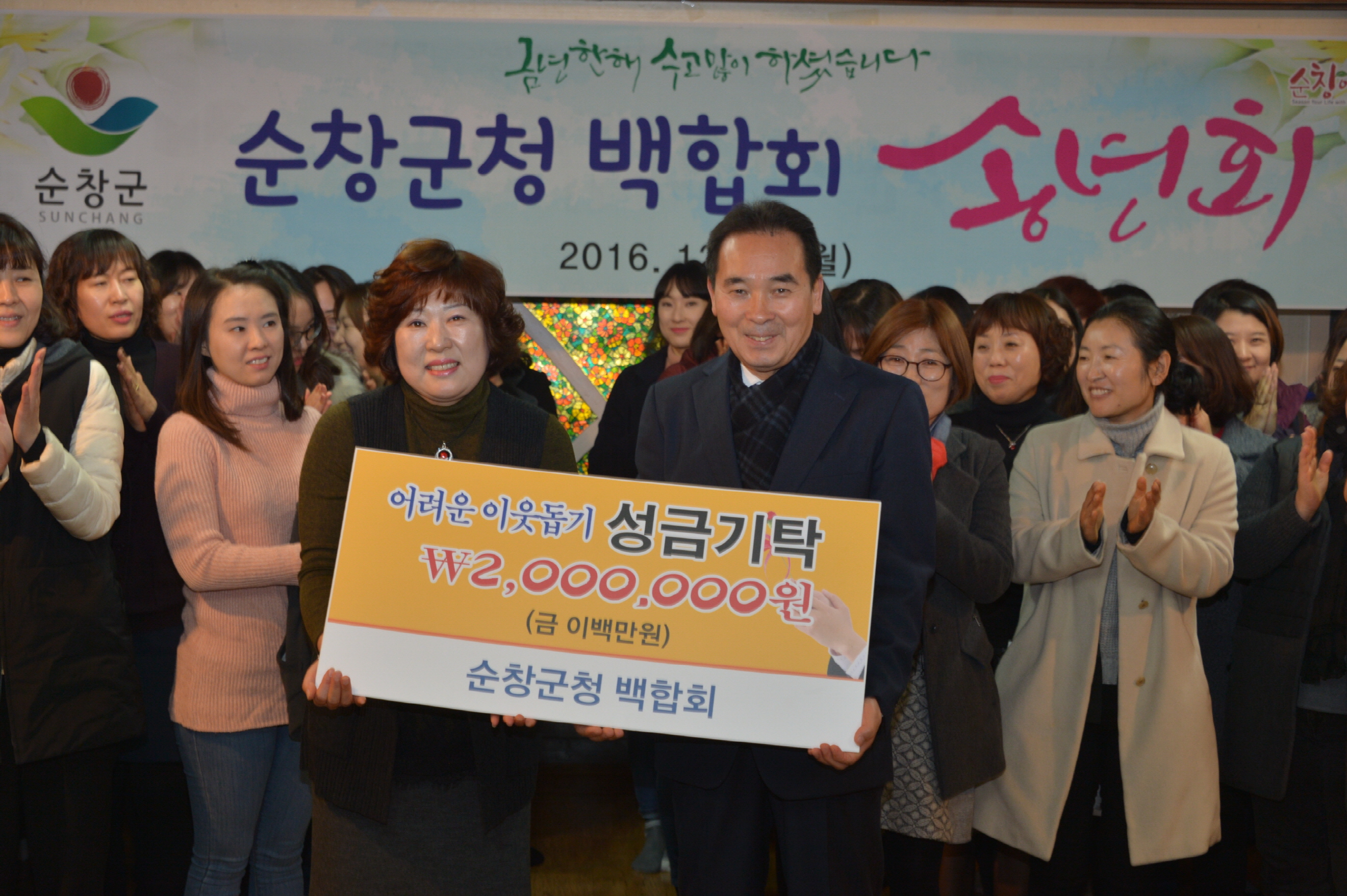 - 순창군청 여성 공직자들의 모임인 백합회(회장 고정숙)가 26일 회원 상호간의 결속을 다지는 2016년 송년회자리에서 십시일반 모은 2백만원을 불우이웃돕기 성금으로 기탁했다. -2016.12.26-