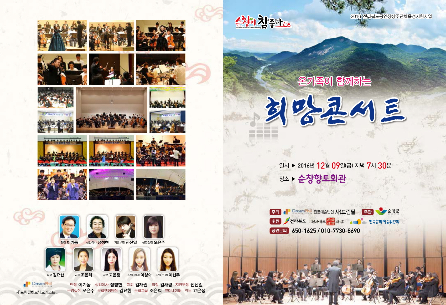 - 오는 9일 순창향토회관에서 겨울 추위를 녹일 드림필 오케스트라의 올해 마지막 공연을 열린다.이번 공연은 ‘온가족이 함께하는 희망콘서트’를 주제로 김재원씨가 지휘하는 드림필 오케스트라가 스비리도프의 ‘눈보라’, ‘쌍두마차’, ‘로망스, 레미제라블 모음곡 등 수준 높은 연주할 예정이다.또 테너 손영호씨의 거룩한 성, 그대 창밖에서를 비롯해 소프라노 문자희 교수의 날 일으켜 주소(You Raise Me UP), 오 거룩한 밤(O Holy Night), 북치는 소년(The Little Drummer Boy) 등으로 관람객들에게 큰 선물이 될 것으로 보인다. -2016.12.06-