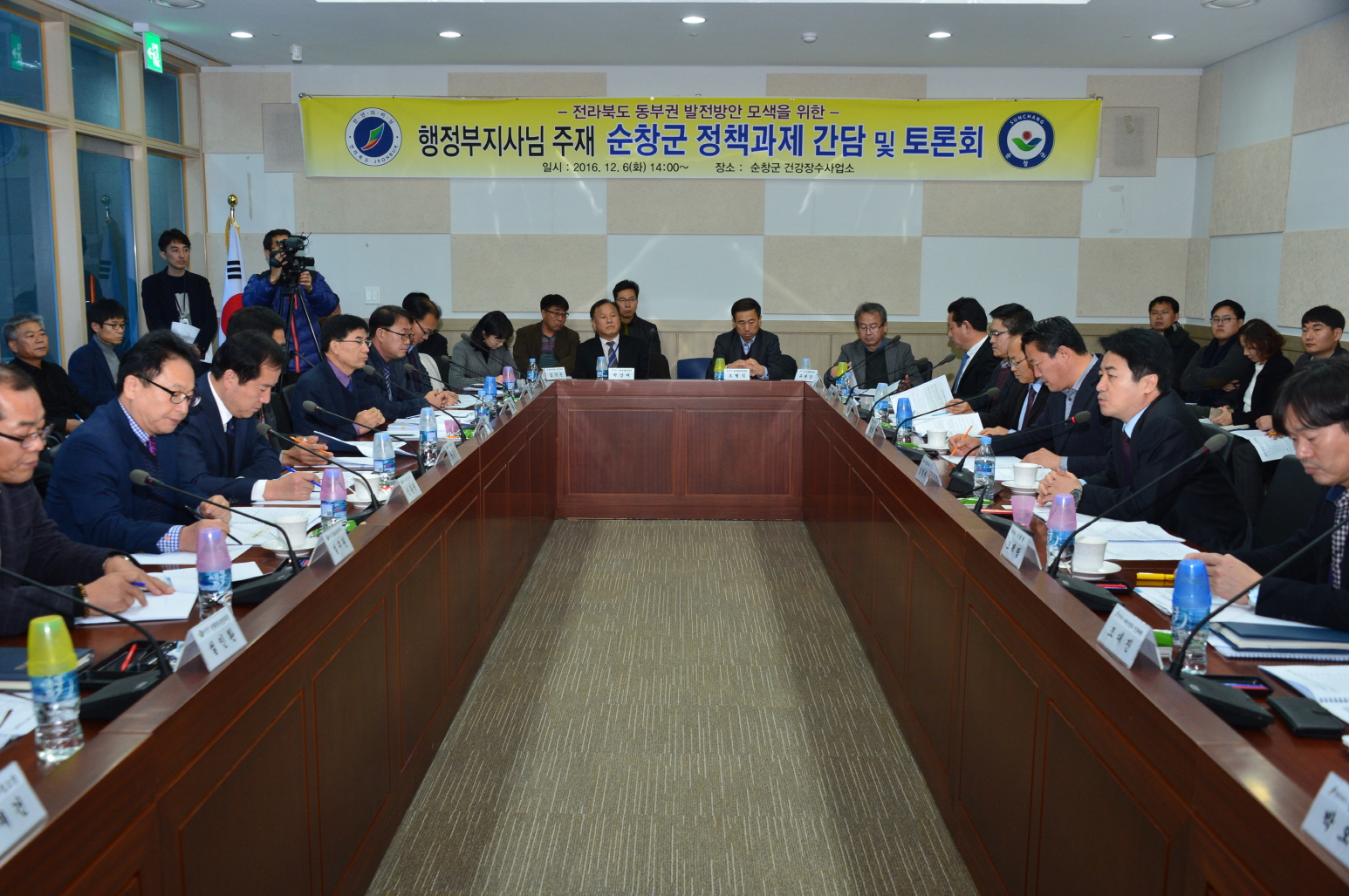 - 전라북도-순창군 지역발전 간담회6일 순창건강장수사업소에서 도와 순창군의 핵심 전략가 20여명이 모여 동부권 발전방안 간담회와 초고령사회 대응방안 토론회를 갖고 순창군 발전을 이끌 핵심사업 찾기와 성공 전략에 대한 심도 있는 논의를 진행했다. 동부권 발전방안 시군 순회간담회는 김일재 행정부지사를 비롯해 최영일 도의원, 오택림 기획관, 신현승 노인장애인복지과장, 김수은 전북연구원 연구위원, 박우성 생물산업진흥원 연구위원, 신동원 순창부군수, 양동엽 기획실장 등 도와 군의 핵심 전략가 20여명이 참여해 상생발전을 이끌 실질적 방안 마련에 머리를 맞대었다.이어 토론회에서는 순창군이 마련한 ‘건강하고 행복한 초고령사회 대응방안’에 대한 심층토론 시간이 이어졌다. -2016.12.06-