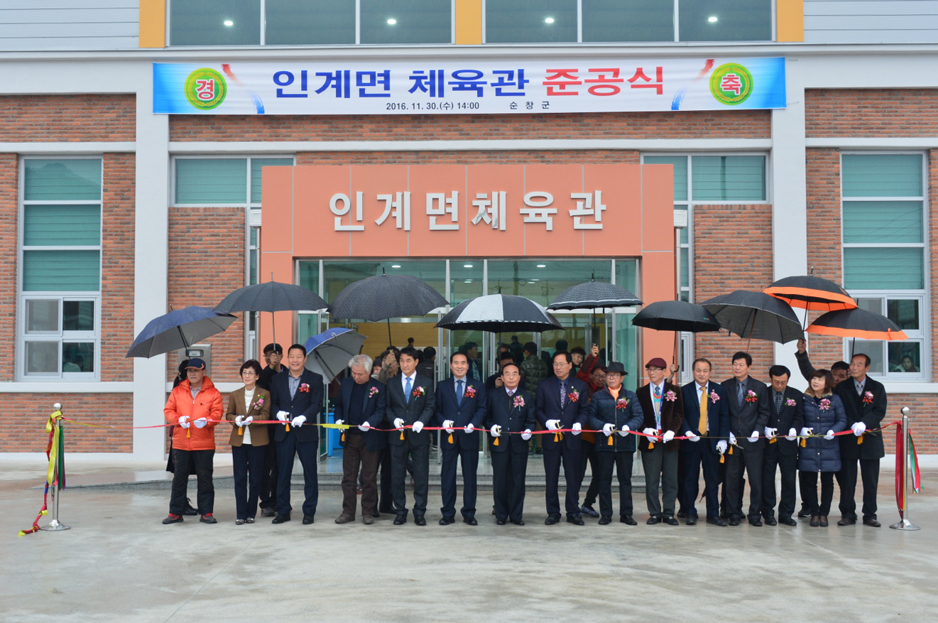 - 인계면 체육관 준공식이 30일 황숙주 군수, 김종섭 군의회 의장, 정성균의원, 전계수의원 등 군의원과 최영일 도의원 등 초청인사와 주민 150여명이 참석한 가운데 열렸다. 인계면체육관은 인계면 870-3번지에 부지면적 2,285㎡에 올해 2월 착공해 완공까지 총 11억원의 예산이 투입하여 지상 1층 연면적 499㎡ 배드민턴 3면에 배구·족구장 겸용 구장을 갖췄다. -2016.11.30-