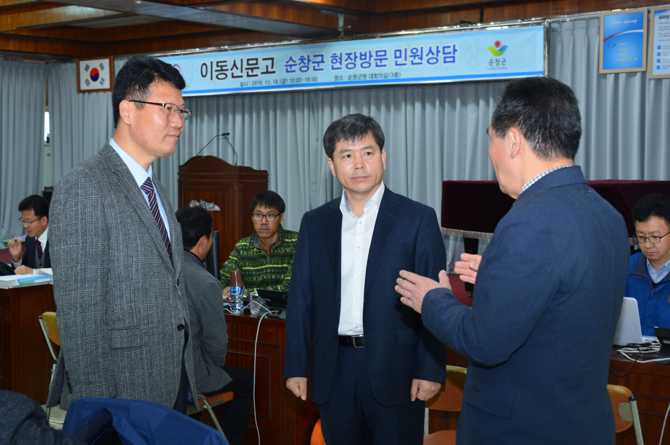 - 18일 오전 10시부터 순창군청 3층 회의실에서 고충민원 해결을 위한국민권익위가 주관하는 ‘이동신문고’를 진행했다. 이날 상담에는 14명의 국민권익위원회 전문 조사관들이 참여하며 행정·문화·교육, 국방·보훈, 경찰, 재정세무, 복지노동, 산업·농림·환경, 주택건축, 도시수자원, 교통도로 등에서 주민고충 사항을 청취하고 해결 방안등에 대해 상담을 진행했다. -2016.11.18-