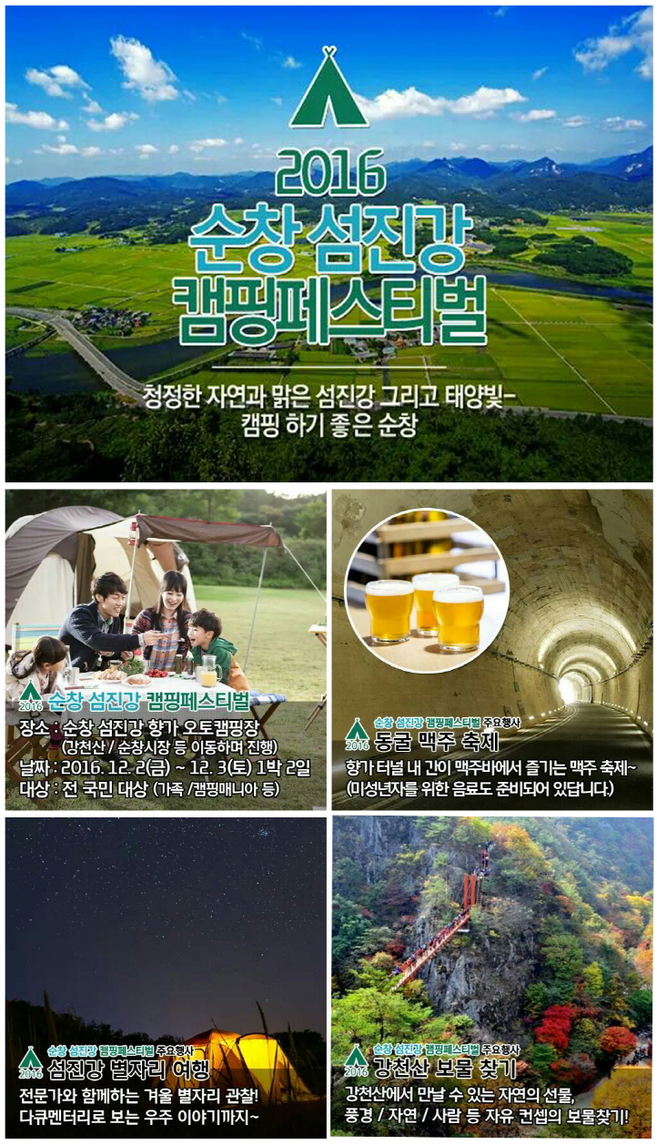 - 순창군이 전국적 캠핑명소로 발돋움 하기위해 오는 12월 2일부터 3일까지 섬진강 캠핑페스티벌을 개최한다. 이번 섬진강 캠핑페스티벌은 가족과 함께 캠핑을 즐기면서 지역의 자연·생태체험은 다양한 문화행사를 통해 지역의 역사와 문화도 알 수 있도록 꾸며진다. 총 30개팀 100여명이 참가하는 행사로 군이 추진하는 첫번째 캠핑 페스티벌 행사로 기대를 모으고 있다. 군은 향가오토캠핑장 주변은 물론 강천산, 고추장민속마을 등을 연계한 프로그램 운영으로 지역의 관광지와 특산품 등도 홍보할 수 있도록 진행할 계획이다. -2016.11.18-