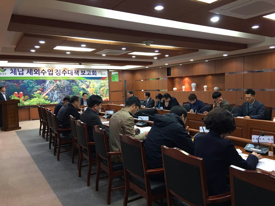 - 순창군은 10일 군청영상회의실에서 신동원 부군수 주재하에 3/4분기 체납세외수입 징수실적과 체계적이고 효율적 징수를 위한 보고회를 가졌다. 이번 세외수입 징수대책 보고회에서는 체납사유를 구체적으로 분석하여 고질체납자는 번호판영치, 예금압류, 공매 등 강력한 체납처분을 추진토록 함으로써 주민의 납부의식을 높일 예정이며 특히 세외수입체납의 75%를 차지하는 새농촌육성기금에 대하여는 체납자의 관련재산을 조사하여 압류와 더불어 공매처분을 추진하고 연대보증인에 대하여도 강력한 납부촉구를 실시할 계획이다. -2016.11.10-