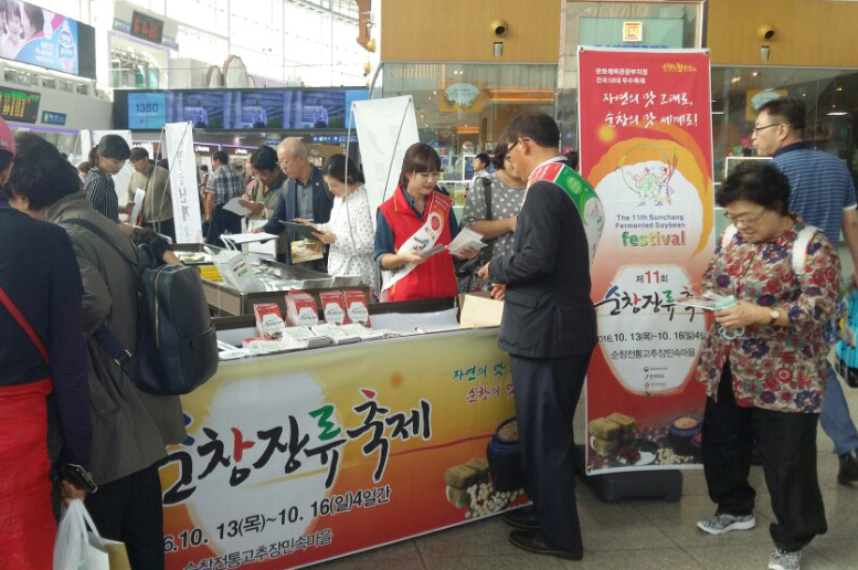 - 순창군은 29일부터 30일까지 서울역 맞이방에서 열린 관광명소 페스티벌에서 순창장류축제와 지역특산품에 대한 톡톡튀는 홍보를 진행해 페스티벌에 참가한 사람들의 이목을 사로잡았다. 이번 페스티벌은 가을철 관광주간을 맞이해 지자체 홍보와 철도를 이용한 여행상품 활성화를 위해 코레일 서울역에서 준비한 행사로 군에서는 오는 10월 13일부터 16일까지 순창고추장민속마을에서 개최되는 제11회 순창장류축제 홍보에 집중했다. -2016.09.30-
