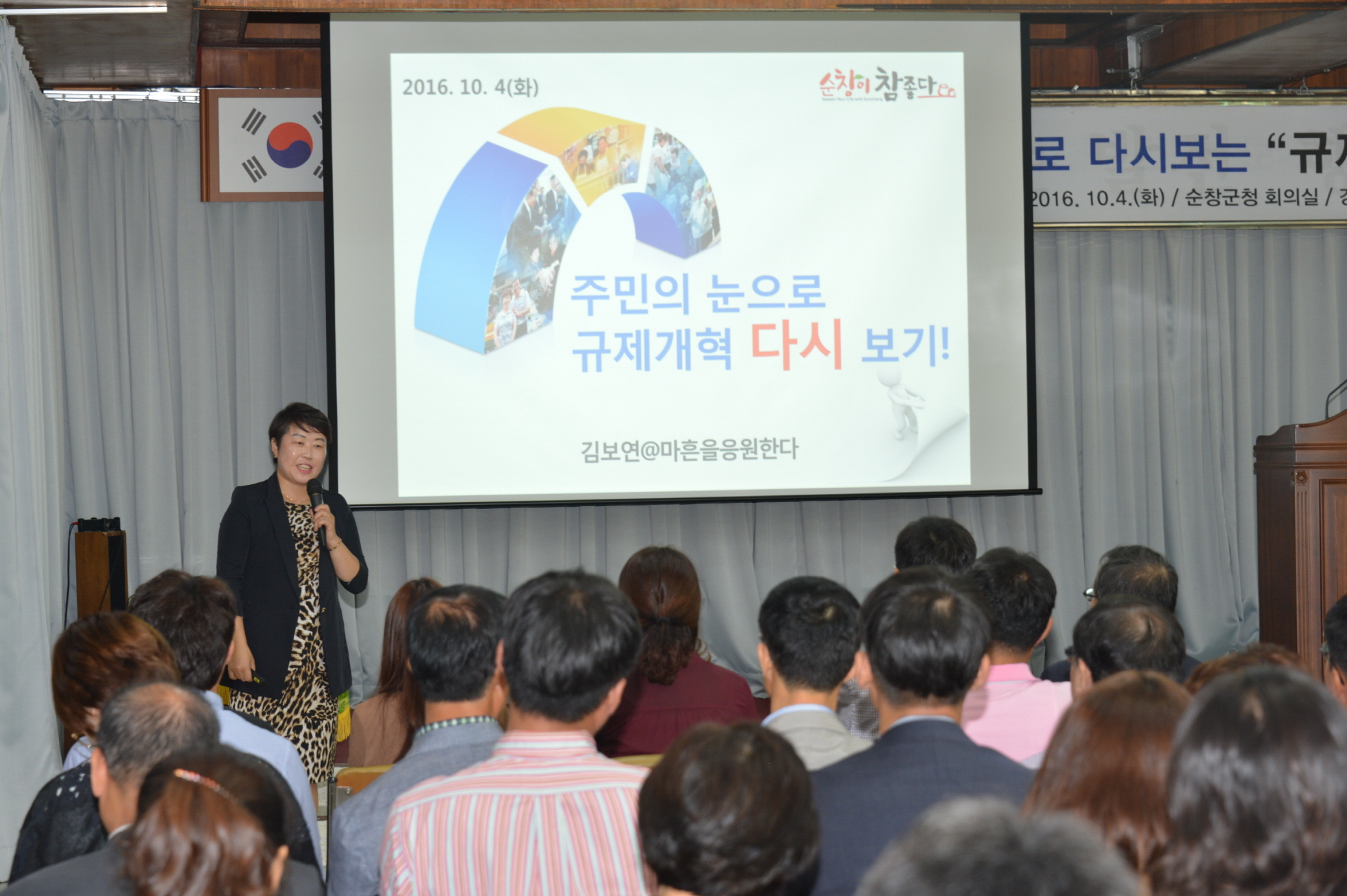 - 4일 3층 대회의실에서 직원 300여명이 참석한 가운데 규제개혁 전문 강사인 나우경영연구소 김보연 소장을 강사를 섭외하여‘주민의 눈으로 규제개혁 다시보기’라는 주제로 특강을 실시했다. -2016.10.04-