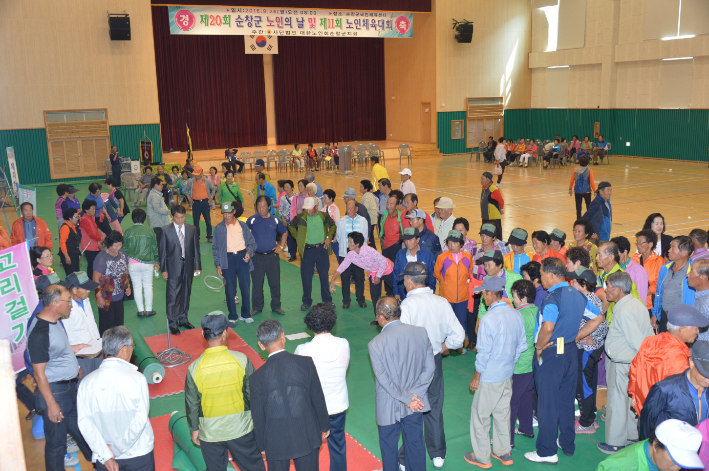 - 26일 어르신들의 노고에 감사하고 경로효친 의미를 생각해보는 제20회 순창군 노인의 날 기념식 및 노인체육대회가 국민체육센터에서 열렸다.대한노인회 순창군지회(회장 김영배)에서 주관한 이날 행사는 기념식에 이어 게이트볼, 윷놀이, 고리걸기, 투호, 제기차기, 한궁 등 체육행사를 통해 지역의 발전의 중추적 역할을 다해 오신 어르신들의 노고에 감사하는 뜻 깊은 자리가 됐다. -2016.09.26-