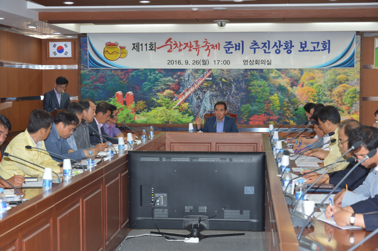 - 제11회 순창장류축제가 가을 대표축제로의 가능성을 열어가기위해 26일 군청 영상회의실에서 17개부서장이 참석한 가운데 제11회 장류축제 추진상황 보고회를 개최했다. 이날 보고회는 황숙주 군수가 주재한 가운데 각부서에서 운영하는 48개 임무에 대해 각 실과장이 추진 상황가 문제점, 대책 등에 대해 보고하고 토의 하는 방식으로 진행됐다. -2016.09.27-