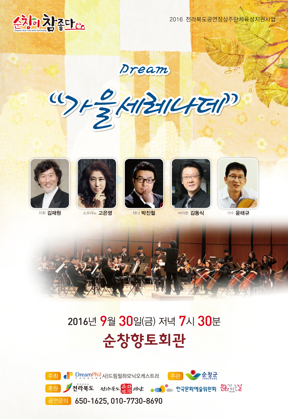 - 30일 금요일 순창 향토관에서 가을에 딱 어울리는 드림필 오케스트라 의 가을 음악회를 개최한다.가을세레나데라는 주제로 가을 음악회는 김재원씨가 지휘하는 드림필 오케스트라의 카르멘 서곡을 시작으로 바리톤 김동수씨의 신고산타령, 소프라노 고은영씨의 그리운 금강산, 테너 박진철의 오 솔레미오 등 아름다운 노래로 펼쳐진다. 또 인기가수 윤태규씨가 출연하여 마이웨이, 그놈의 술 등을 불러 관객들의 흥을 돋우고 후반부에는 존멘버의 히트작 Perhaps Love, 코머스 쿡의 Funicula-Funicula 등 성악가들의 웅장하고 환상적인 중창으로 대미를 장식할 예정이다. -2016.09.29-