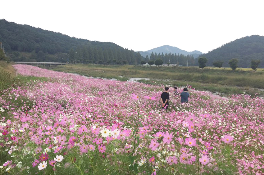 - 팔덕면 작천변에 ‘가을의 전령’인 코스모스가 만개해 지역 주민들과 강천산을 찾는 관광객들의 발길을 사로잡고 있다.팔덕면 구룡리 작천변에 위치한 코스모스 단지는 1ha 규모로 지난해 면에서 도로변 코스모스 씨앗을 직접 채취해 지난 7월에 파종 및 비료를 뿌려 조성했다. -2016.09.29-