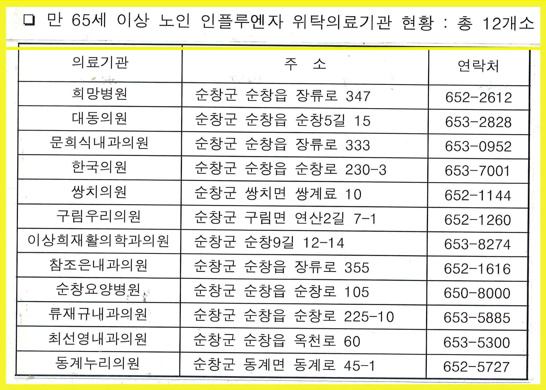 - 순창군은 10월 4일부터 관내 12개소 병의원에서 만 65세이상 어르신들의 인플루엔자 무료 예방접종을 본격 실시한다.순창군에 주소를 둔 만 65세 이상 어르신들은 10월 4일부터 관내 대동의원, 류재규내과의원, 문희식내과의원, 순창요양병원, 희망병원, 이상희재활의학과의원, 참조은내과의원, 최선영내과의원, 한국의원, 동계누리의원, 쌍치의원, 구림우리의원에 신분증을 지참하고 방문하면 된다. -2016.09.28-