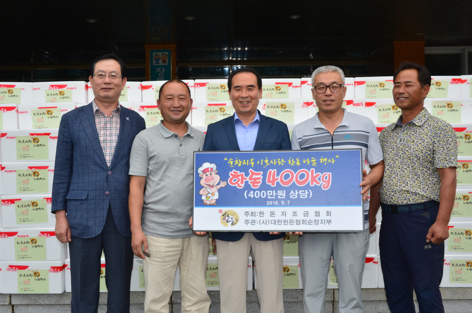 - 한돈협회 순창지부(회장 정운호)가 민족 대명절 추석을 맞아 어려운 이웃과 따듯한 추석명절 나기에 나섰다.7일 정운호회장 등 회원들은 순창군청을 찾아 돼지고기 360kg 시가 380만원상당을 전달했다. 정회장은 “작은 정성이지만 어려운 이웃들이 따뜻한 명절을 나는데 도움이 됐으면 한다”고 말했다. 전해진 돼지고기는 관내사회복지시설의 어려운 이웃을 위해 쓰여질 계획이다. -2016.09.07-