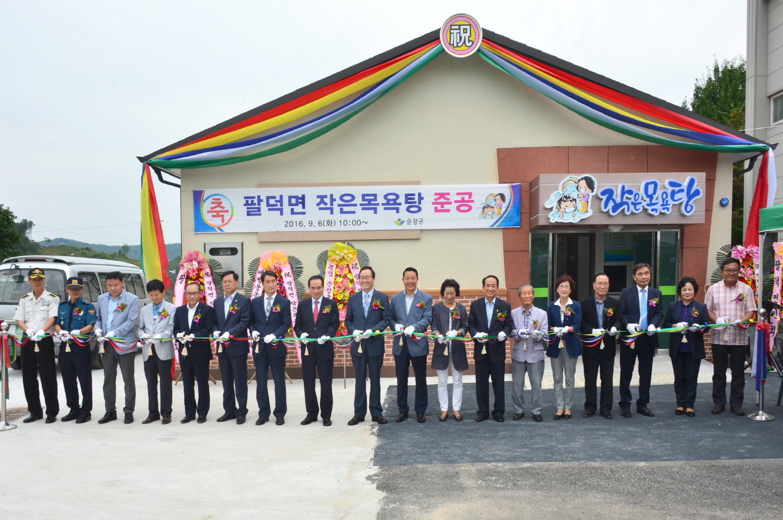- 6일 송하진 도지사, 황숙주 군수, 김종섭 군의회 의장과 군의원, 팔덕면 기관단체장 등 내빈과 면민 300여명이 참석한 가운데 팔덕면 작은 목욕탕 준공식을 가졌다.팔덕면 작은 목욕탕은 부지면적 948㎡에 건축면적 150㎡규모로 팔덕보건지소 옆에 들어섰으면 사업비 2억8천만 원을 투입하여 이번에 완료했다. 7일부터 여자는 월요일과 수요일, 남자는 금요일에 이용할 수 있으며, 일반 주민들은 목욕탕 이용요금의 반값인 2천원, 노인들은 천원, 취약계층은 무료로 이용이 가능하다. -2016.09.06-