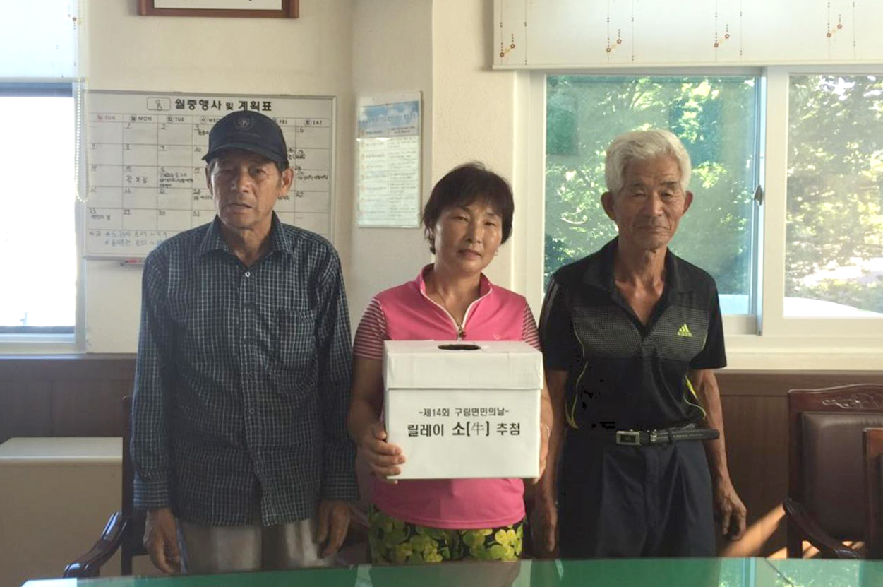 - 오는 8월 28일 제14회 구림면민의 날이 열리는 구림초중학교에서 송아지 3마리로 이웃사랑 릴레이를 펼친다.이번 송아지 릴레이 행사는 지난 13회 구림면민의 날 행사 때 윤효섭씨가 송아지 한 마리를 기증하면서 시작된 행사로 오는 14회 구림면민의 날을 맞아 산내마을 최광식씨와 오룡마을 김영섭씨가 동참하면서 송아지 3마리로 늘어난 것.이번에 기증한 송아지는 300~350상당의 암송아지로 분양받은 주민이 2년 간 키워 새끼를 낳으면 또 다른 이웃들에게 전달하는 릴레이 행사로 이어진다.16일 구림면사무소 회의실에서 구림면민의날 운영위원들이 참여한 가운데 추첨한 결과 윤인호(치천), 오성자(유사), 방양원(연산)씨가 각각 선정됐다.(사진 왼쪽부터) -2016.08.16-