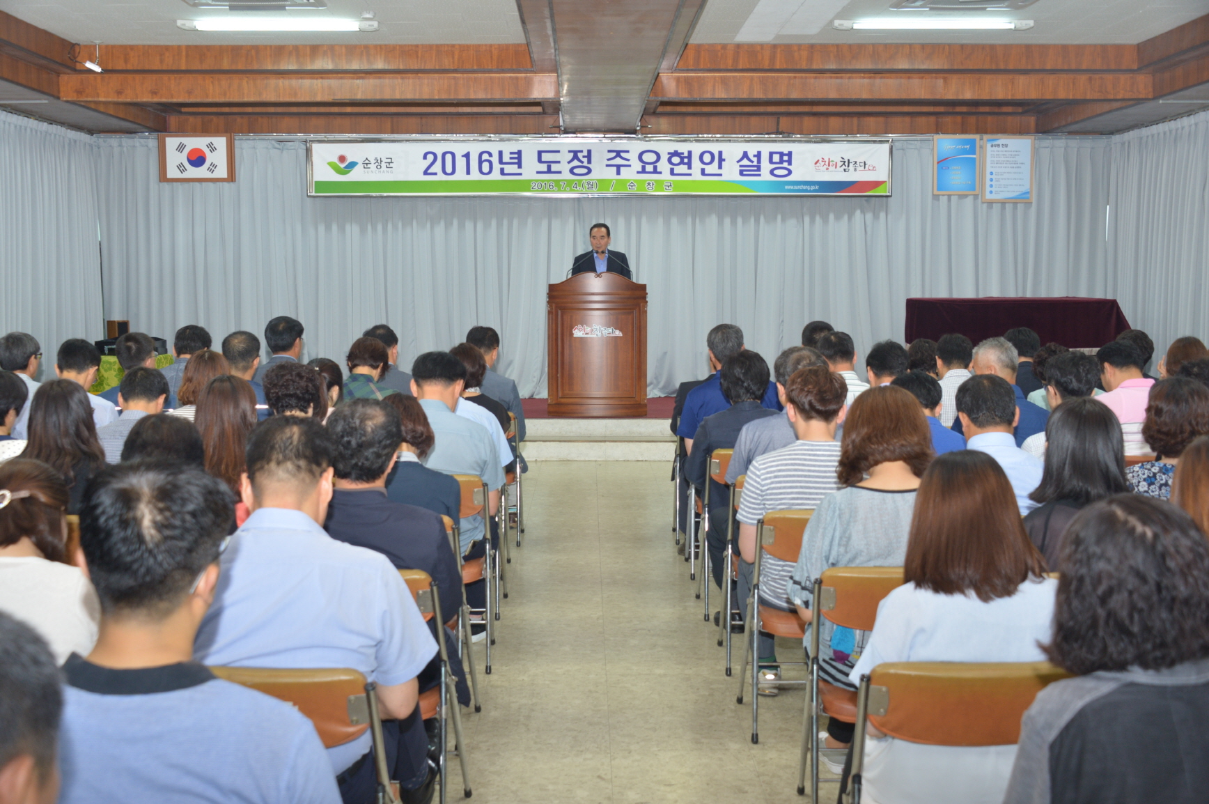 - “순창 발전을 위해서는 농업경쟁력을 강화해 농민들이 행복하게 농사를 짓게 해주고 최대한 많은 국가예산을 확보해 지역 성장동력을 확보하는게 중요합니다.” 또 “지역 브랜드 가치를 높여 관광객을 유입하고 지역의 농특산물이 잘팔리게 만드는 선순환 구조를 만들어야 합니다.” 황숙주 군수가 4일 군청 3층 회의실에서 열린 7월 중 월례조회에서 민선 6기 후반기 비전에 대해 설명했다. -2016. 07. 04-