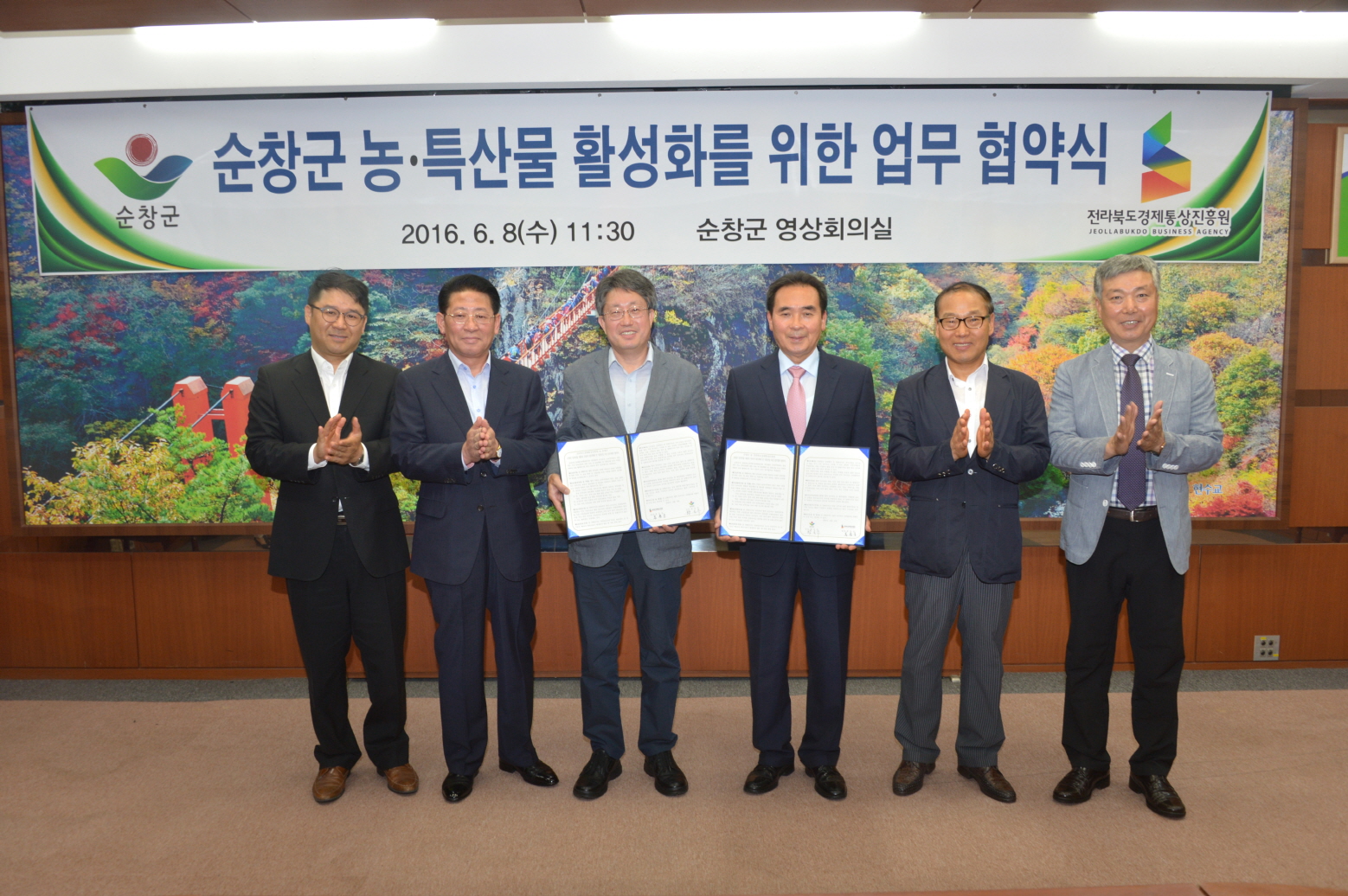 - 8일 군청영상회의실에서 열린 순창군 농특산물 판매망 확대 및 식품산업 육성을 위해 순창군과 전라북도경제통상진흥원이 업무협약을 체결했다.이날 업무협약식에는 황숙주 군수, 전라북도 경제통상진흥원 홍용웅 원장 등 관계자 10여명이 참석한 가운데 전라북도경제통상진흥원이 구축하고 있는 국내·외 다양한 네트워크를 활용해 순창군 농축산물의 판로를 확대하고 인적 물적 교류를 통해 군이 추진하고 있는 식품산업을 활성화 시키기 위해 추진됐다. -2016. 06. 08-