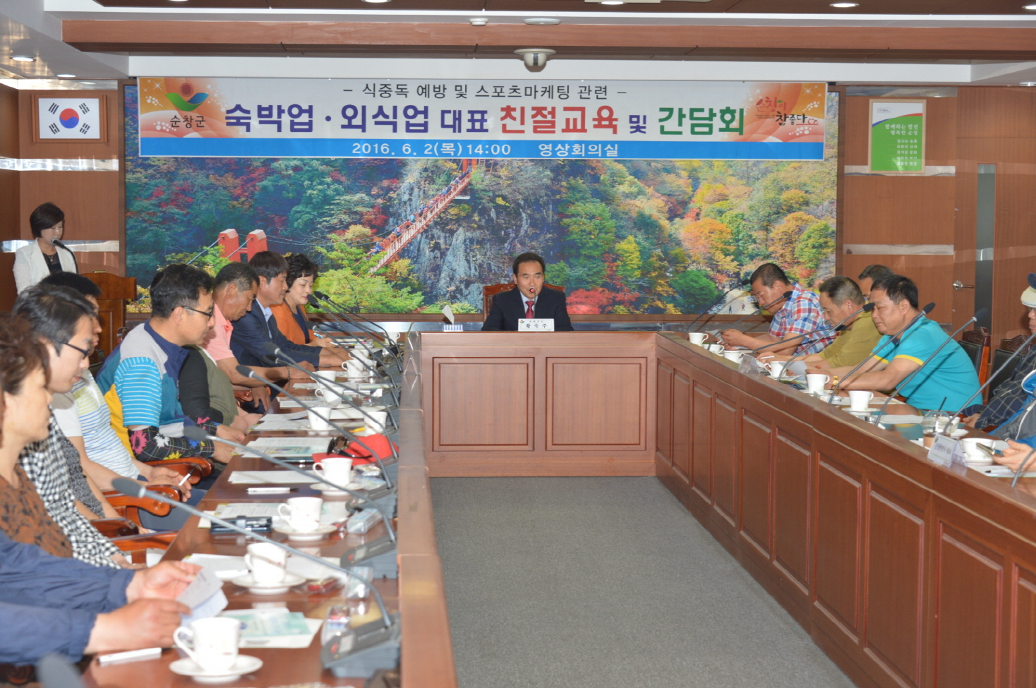 - 순창군이 스포츠 마케팅으로 지역 방문객이 늘어남에 따라 2일 숙박업 관계자 40여명 참석한 가운데 관련 음식업소 친절교육 및 간담회를 가졌다. -2016. 06. 02-