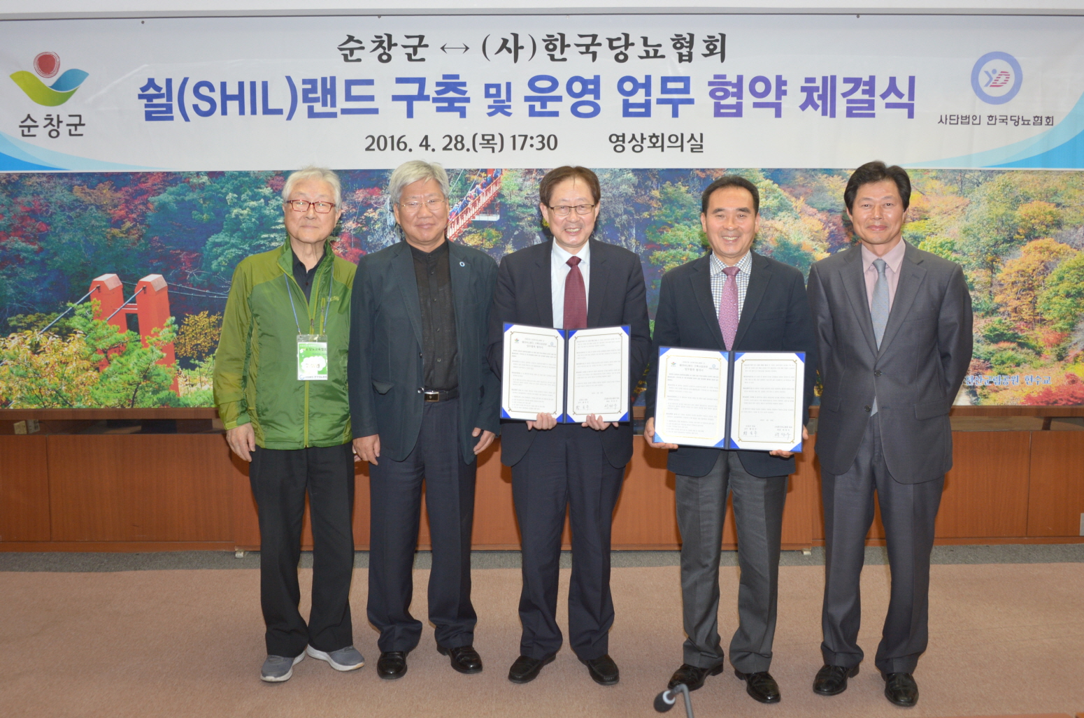 - 28일 군청 영상회의실에서 황숙주 군수를 비롯해 사단법인 한국당뇨협회 박성우 회장, 임영배 총무이사, 홍보대사 탤런트 김성원씨 등 관계자 20여명이 참석한 가운데 단법인 한국당뇨협회와 쉴(SHIL)랜드 구축사업 관련 업무 협약을 체결했다. 쉴(SHIL)랜드는 Sunchang Health Institute Longevity의 약자로 순창군 인계면에 위치한 건강장수연구소 일원을 휴식과 치유를 융합한 대표 관광지로 만들기 위한 개발 프로젝트다. -2016. 04. 28-