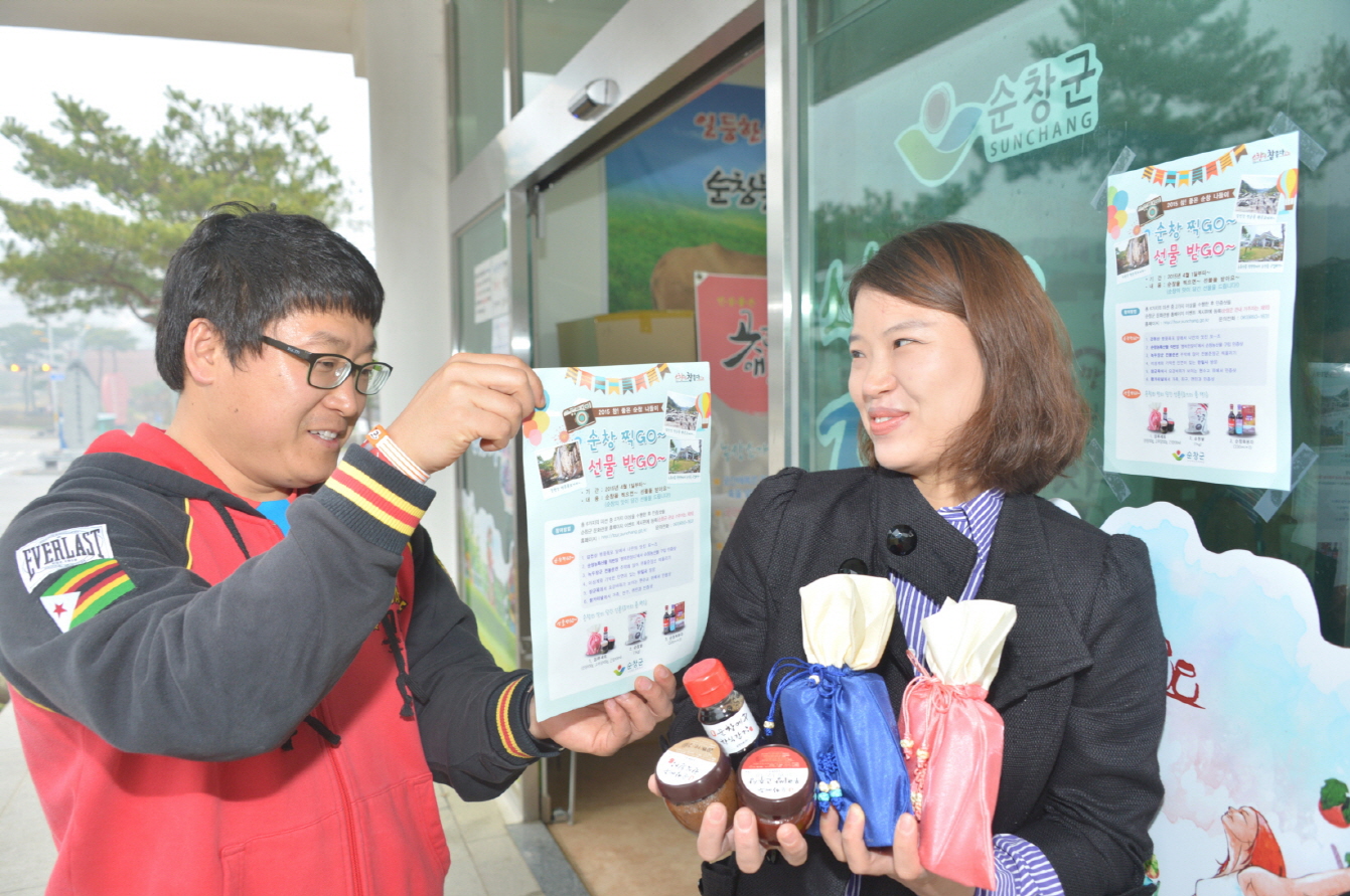 - 순창에 가서 관광사진을 찍고 군 홈페이지에 4월 4일부터 등록하면 순창 특산품을 선물로 받을 수 있다. 관광객을 대상으로 6가지 미션 중 두 가지 이상을 수행한 인증샷을 순창군 문화관광과 홈페이지 이벤트 게시판에 등록하면 선물을 지급하는 ‘순창 찍GO, 선물 받GO'행사를 진행한다. 이벤트에 참여할 미션은 ▲강천산 병풍폭포 앞에서 나만의 멋진 포즈 ▲순창 농특산물직판장에서 농특산물 구입 인증샷 또는 순창장류박물관에서 임금님 밥상에서 체험 인증샷 ▲녹두장군 정봉준관 주막에 앉아 인증샷, ▲장군목에 현수교에서 인증샷, ▲향가 스카이워크에서 가족 친구 연인과 인증샷이다. -2016. 04. 01-