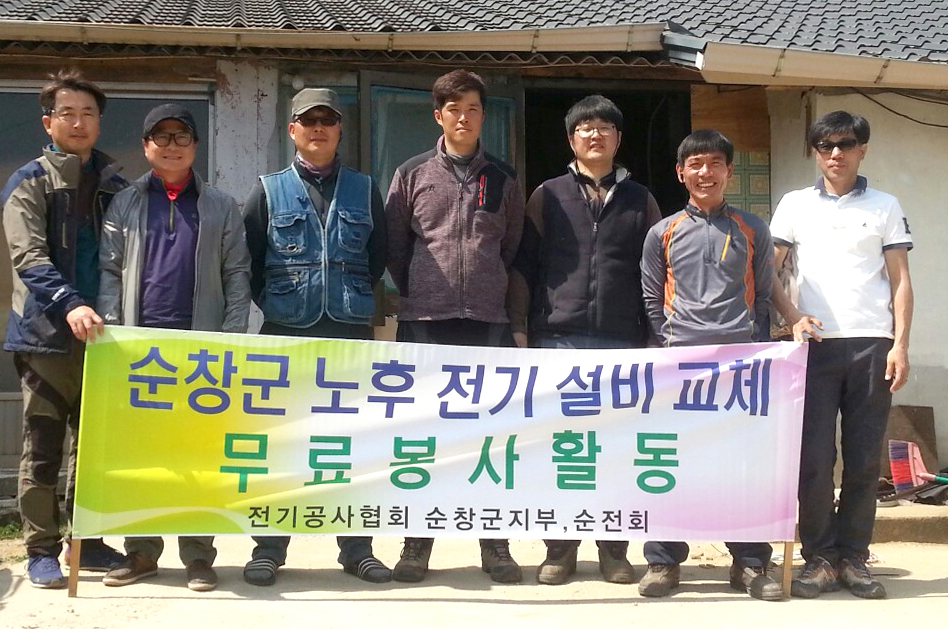- 전기공사협회 순창군지부와 순전회원 8명은 1일 팔덕면 월곡리 저소득층 가정을 방문해 낡고 위험한 노후 전기설비를 교체하는 이웃사랑을 실천해 주위의 귀감이 됐다. -2016. 04. 01-