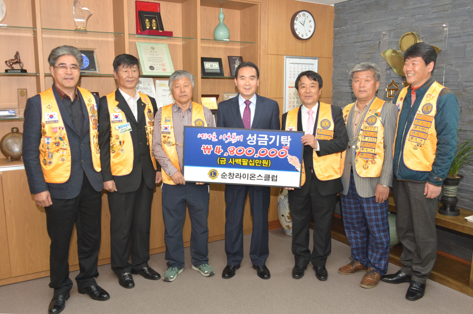 - 순창라이온스클럽 김현식 회장과 회원들은 29일 순창군청을 찾아 어려운 이웃들에게 써달라며 480만원의 성금을 황숙주 군수에게 지정 기탁했다. 이날 성금은 이웃돕기 일일찻집과 회원들이 십시일반 모아 성금으로 마련하였다. -2016. 03. 29-