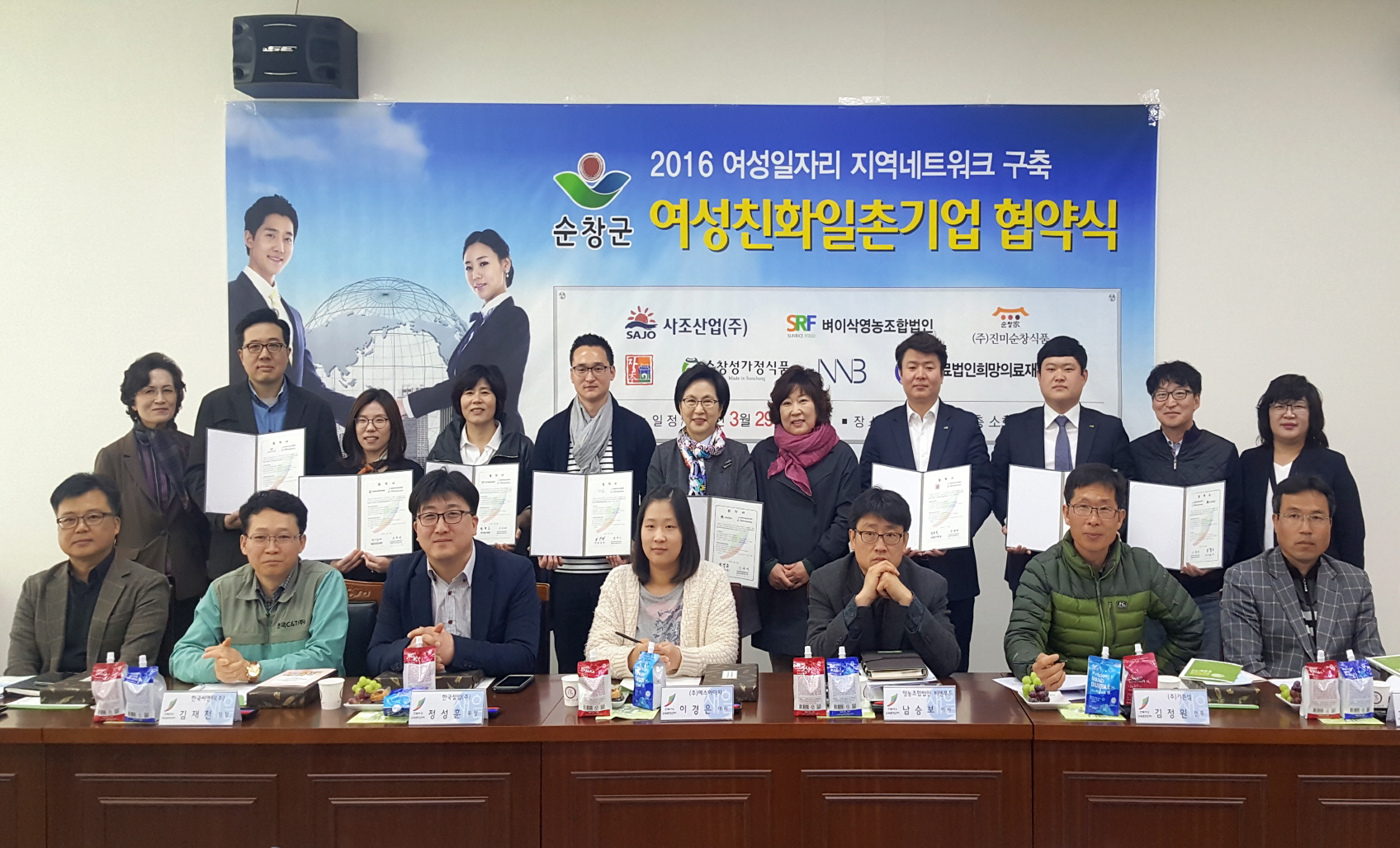 - 29일 순창읍사무소 회의실에서 전라북도광역새일센터(센터장 신수미)가 지원하는 여성친화일촌기업 협약식과 함께 기업인사담당자를 대상으로 일자리지원사업 설명회가 있었다. 이날 협약식에는 지역의 대표적 기업인 사조산업(주), 의료법인희망의료재단, (주)진미순창식품, 순창장본가전통식품, 벼이삭영농조합법인, 농업회사법인(주)성가정식품, (주)앤앤비 등 7개 업체가 참여하였다. -2016. 03. 29-