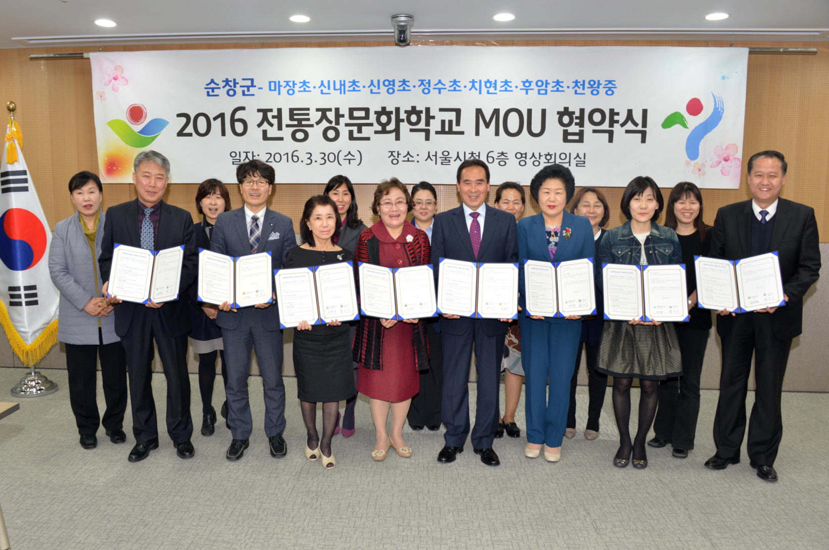 - 30일 황숙주 군수를 비롯해 서울시친환경급식 담당관 및 학교장 등 관련자 20여명이 참석한 가운데 서울시청 6층 영상회의실에서 서울소재 7개 초·중학교와 정통장문화학교의 성공적 추진을 위한 업무협약을 체결했다. 전통장문화학교에 참여하는 학생들은 순창을 직접 방문해 순창장류을 사용해 차린 집밥을 맛보고 기능인과 함께 고추장, 된장, 간장만들면서 전통장에 대한 가치를 배운다. 또 친환경 농장을 방문해 가마솥에 밥짓기, 쌈채소 따기, 두부만들기 등을 통해 현장체험을 하며 식사를 해결하는 생생한 현장형 체험이 4월 1일부터 한달간 7회에 걸쳐 진행된다. -2016. 03. 30-