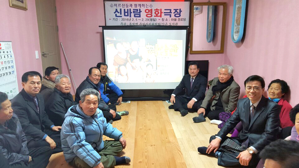 - 동계면 주민자치위원회(위원장 양진엽)는 농한기를 맞아 어르신들에게 직접 찾아가는‘신바람 영화극장’을 운영하고 있다. 지난 5일 용동마을을 시작으로 매일 오전과 오후 2차례씩 계속 상영하고 있으며, 이달 말까지 일정이 빼곡할 정도로 원하는 곳이 많다. -2016. 02. 19-