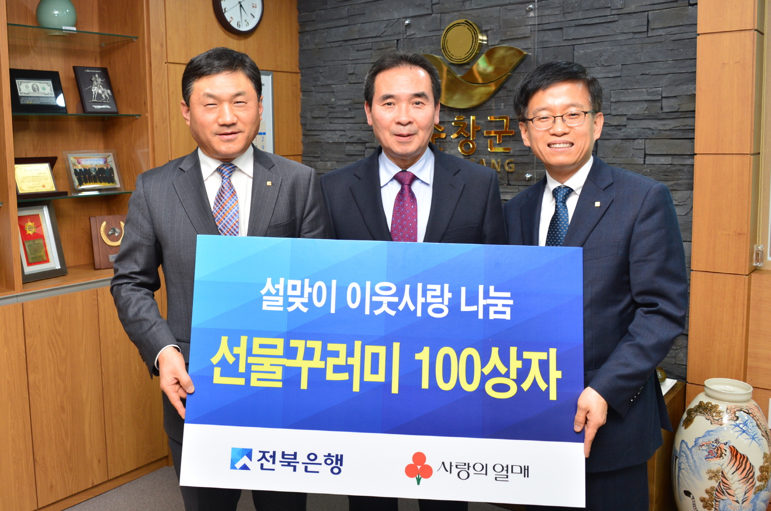- 전북은행 황인철 순창지점장과 양모센터장은 26일 설명절을 맞아 소외된 이웃들에게 전해 달라며 황숙주 순창군수에게 선물꾸러미 100개를 전달하며 훈훈한 온정을 전했다. -2016. 01. 26-